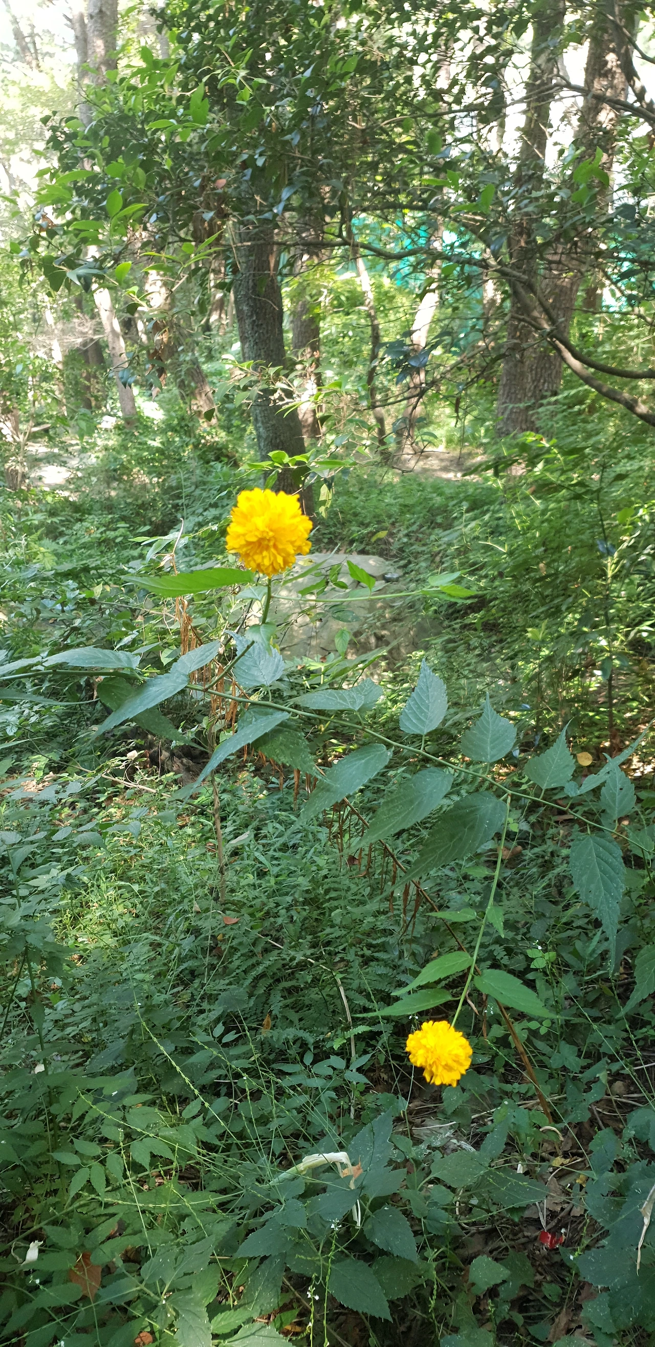 이온음료 한 모금을 들이켜다 보니 조금 떨어진 곳에 노란 꽃이 보였다. 황매화인가, 지금쯤이면 다 지지 않았나, 하는 생각을 하며 다가갔다. 황매화다. 작은 국화 같기도 하고 작은 솜뭉치 같기도 한 겹황매화다. 찾아보니 다른 황매화와 구분하여 부르기 위해 죽단화라 부르기도 한단다. 다시 생각을 했다. 왜 아직 피어 있지.