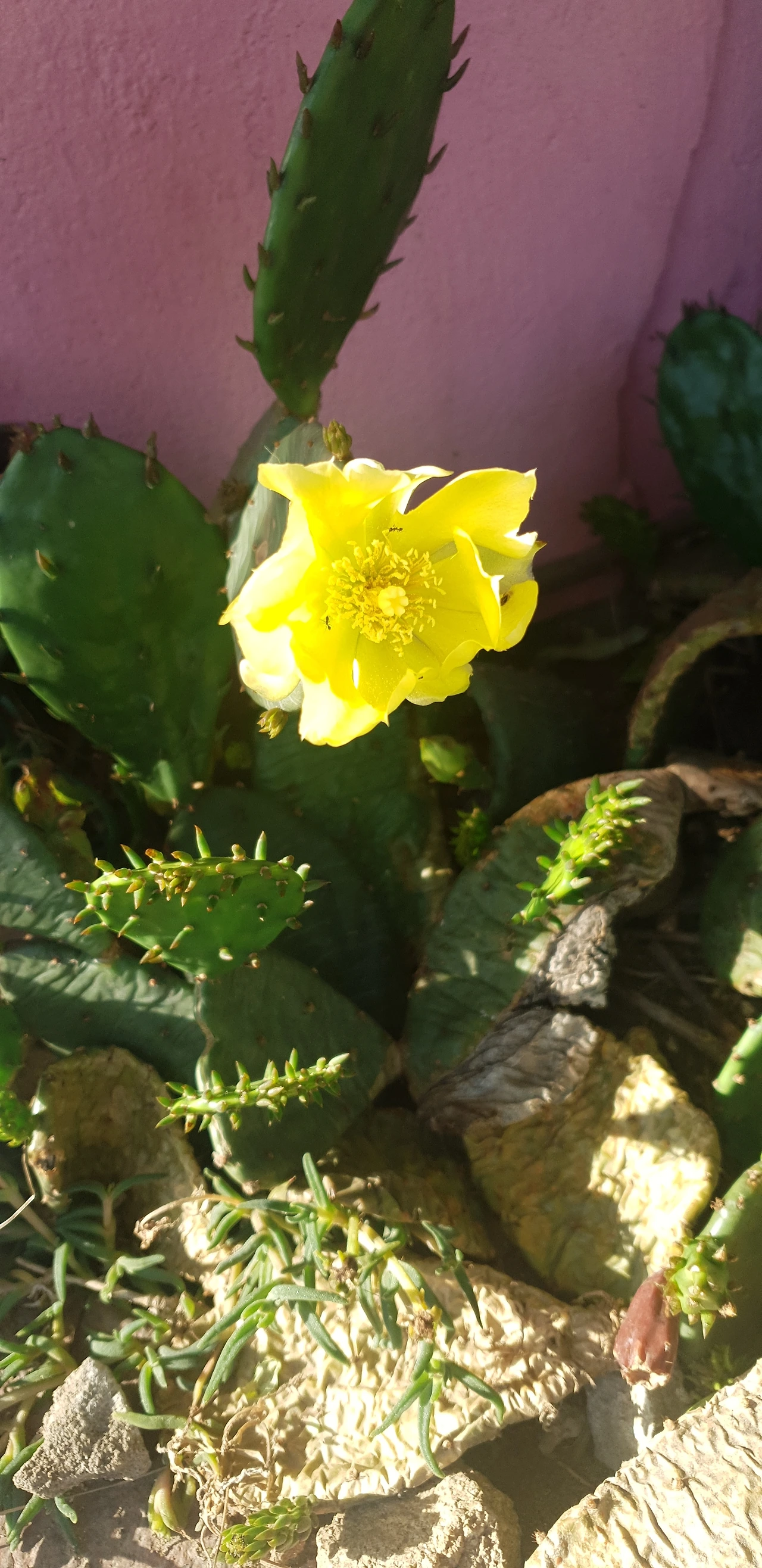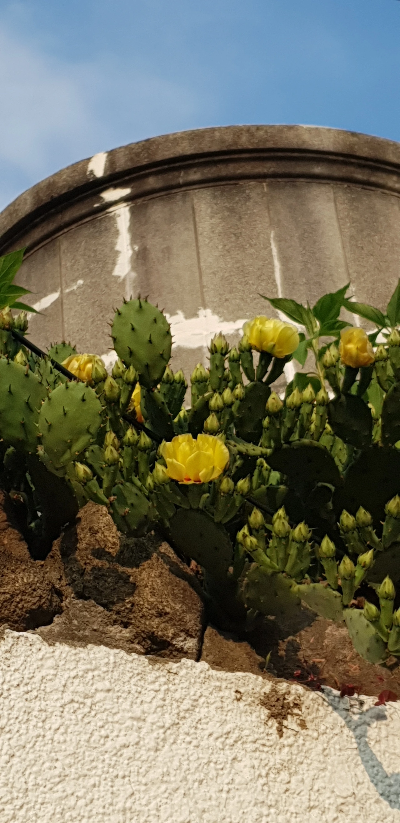 늘 지나가며 보던 것이라도 때를 놓치거나 주의 깊게 보지 않으면 보지 못하는 꽃과 열매가 있다. 설령 보더라도 무지로 인해 그 가치를 모르고 지나가는 것들도 있다. 지난 6월이었다. 일전에 얘기했던, 줄지어 어깨를 맞대고 서 있는 빨간 벽돌집들 중 맨 마지막 집은 대문 위, 작은 화단에 선인장들 무리를 이고 있다. 그 집 앞을 지나는데 선인장 끝에 노란 꽃이 폈다. 딸과 함께 멈춰 서서 사진을 찍고, 야, 색깔이 수선화 뺨치는구나, 하고 지나갔다.
