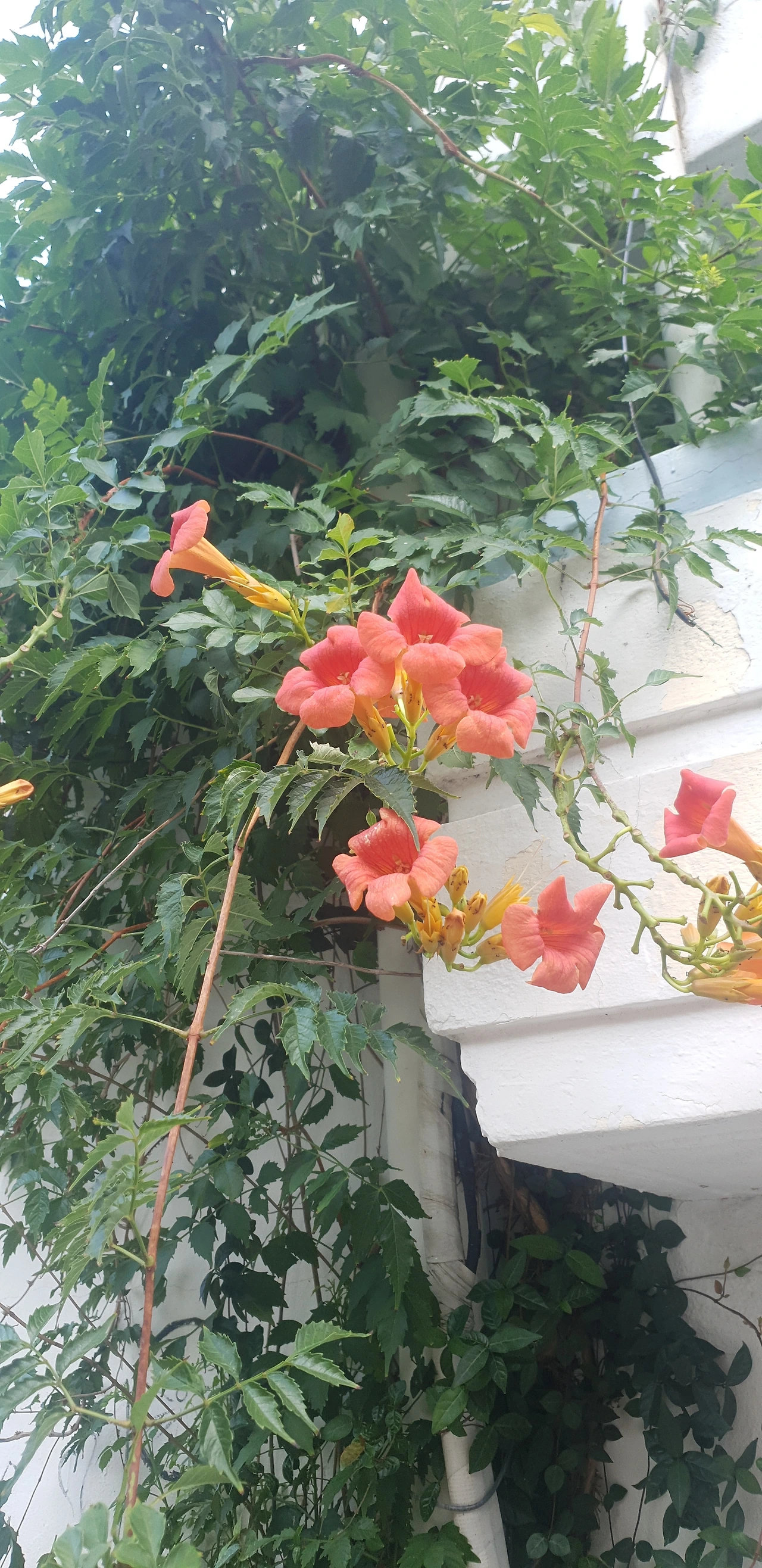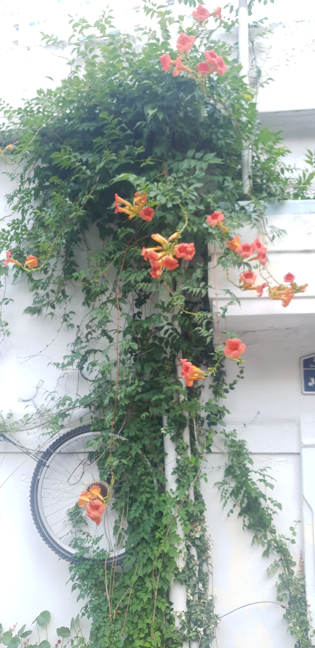 학교 앞에 짓던 건물은 다 올라갔는데, 일반 주택은 아닌 것 같아 딸과 다가가 건축 안내판을 보니, 체육 시설이다. 딸은 학교 입구에서 가방을 건네받아 올라갔고, 난 돌아 내려오며 학교 앞 허름하고 낮은 집 담벼락을 따라 피어 내린 미국 능소화를 렌즈에 담았다. 여전히 중국 능소화도 곳곳에 펴 있으나 유독 명줄이 긴 아이들 몇몇이 버티는 모양새였다. 반면 미국 능소화는 제법 기세 좋게 피어 있었다. 진하고 붉게, 작고 단단하게.