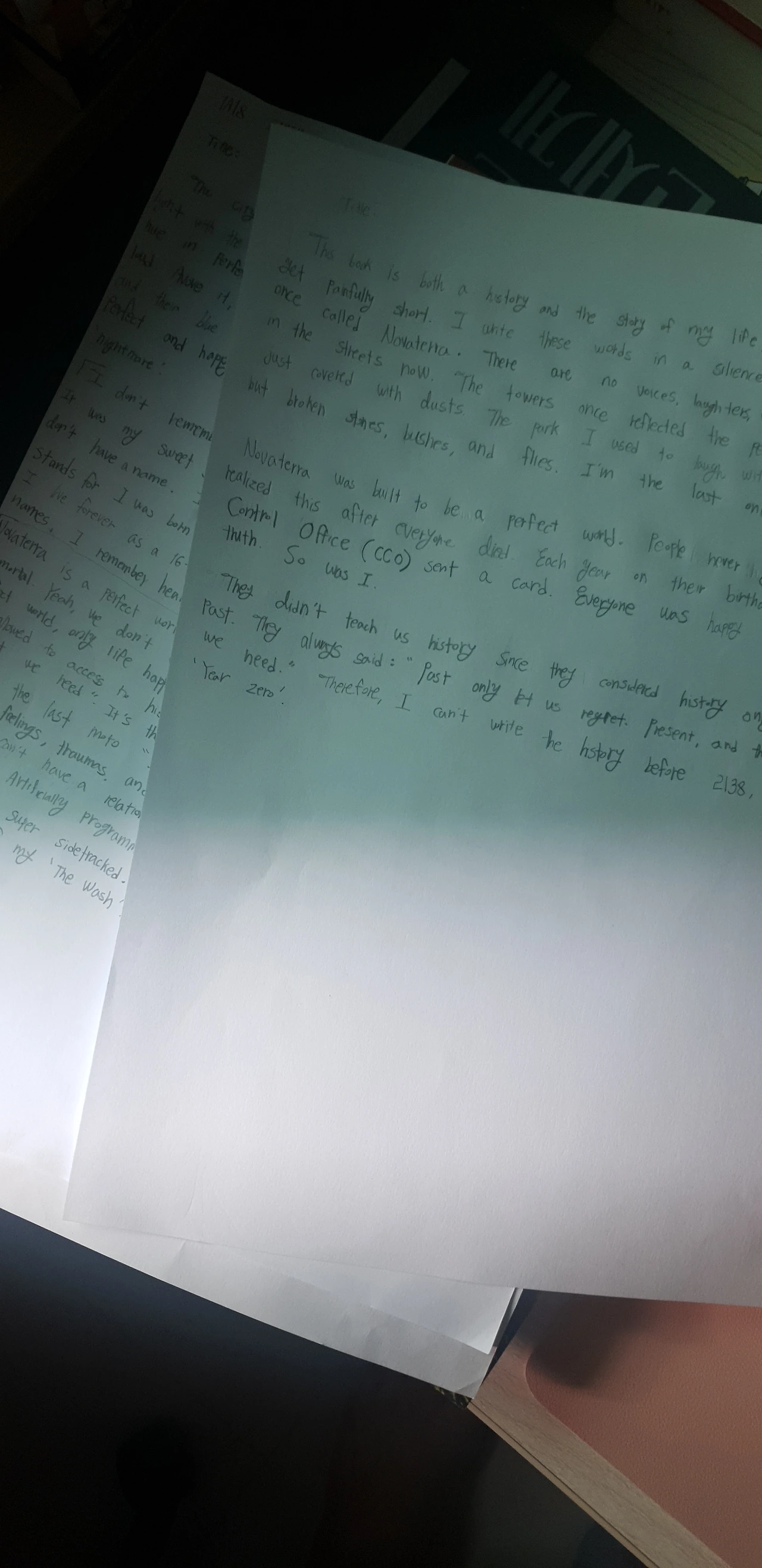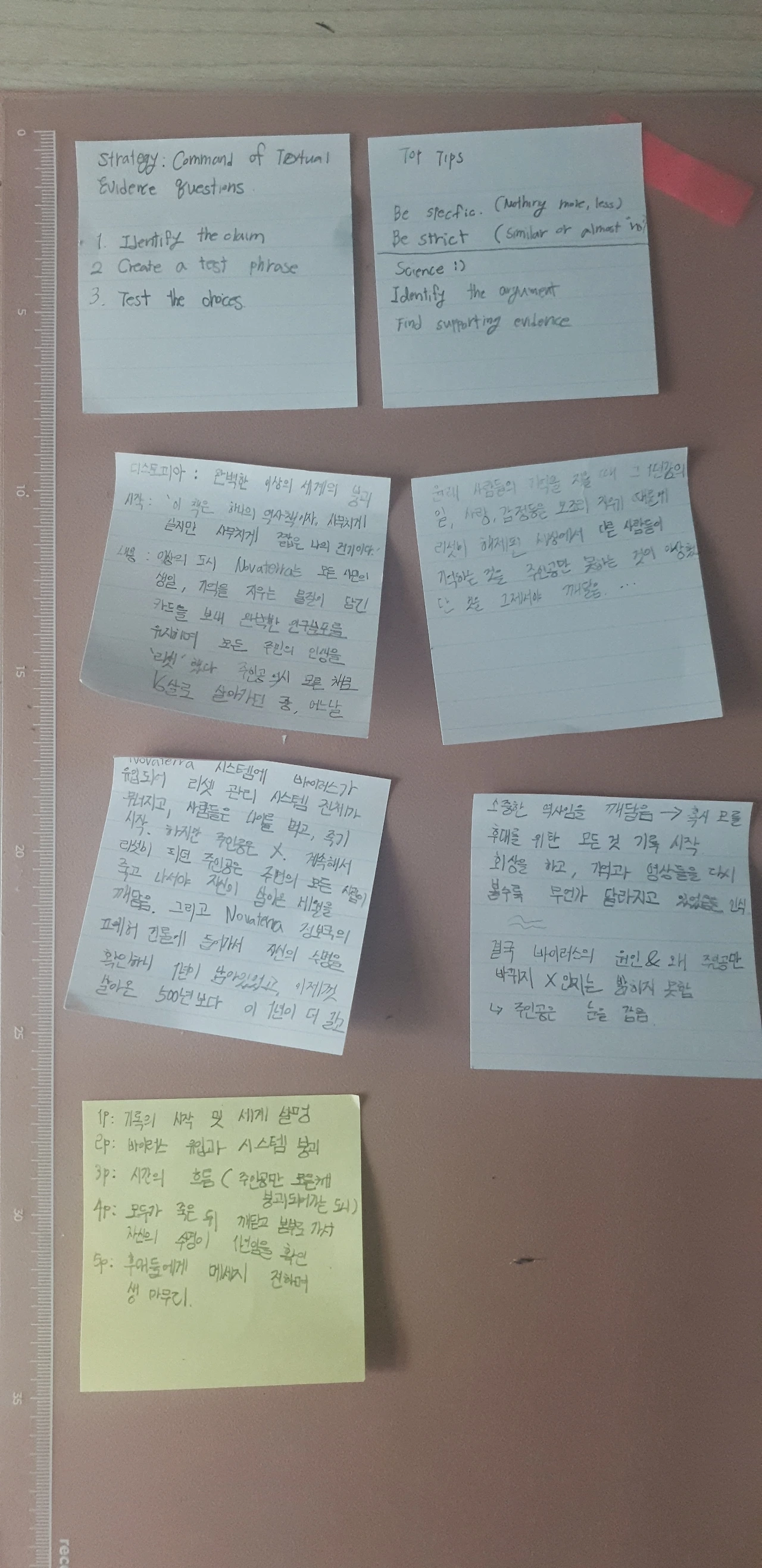 연락을 기다리는 한, 이틀 동안 딸은 밤마다 영재 교육원의 과제를 해나갔다. 소재가 특이하다. 열여섯 살 소녀가 어느 날, 자신이 5백 년간 살아왔다는 걸 알게 된 후의 이야기다. 장르는 SF 소설. 당연히 영어로 써야 한다. 그것도 육필로, A4 다섯 장. 비슷한 모티브가 있는 소설과 영화에 대해 딸과 이야기를 나눴다. 소설적, 영화적 장치에 대해서도 의견을 나눴다. 플롯을 포스트잇에 메모해서 붙여 놓은 뒤, 그에 맞게 단락을 구성하고 분량을 조절해 보라고 했다.