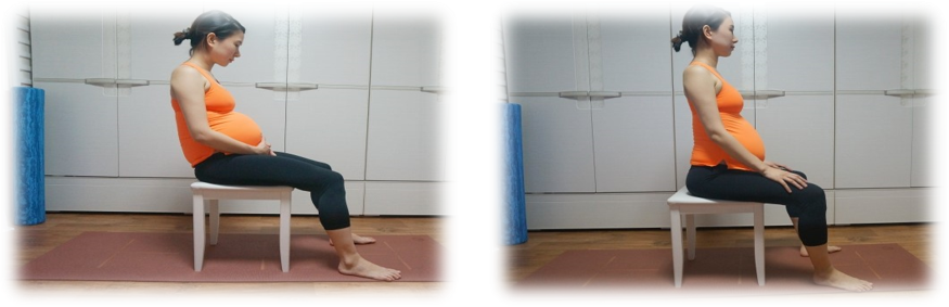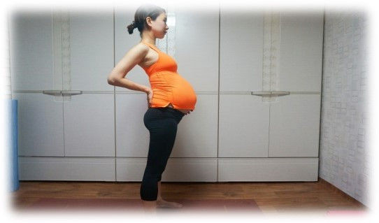 (몸이 점점 무거워서 배는 앞으로 내밀고 한 손은 허리를 받치고 있다. 둔부 쪽으로는 힘을 하나도 주지 않고 오직 허리로만 버티고 있는 것)