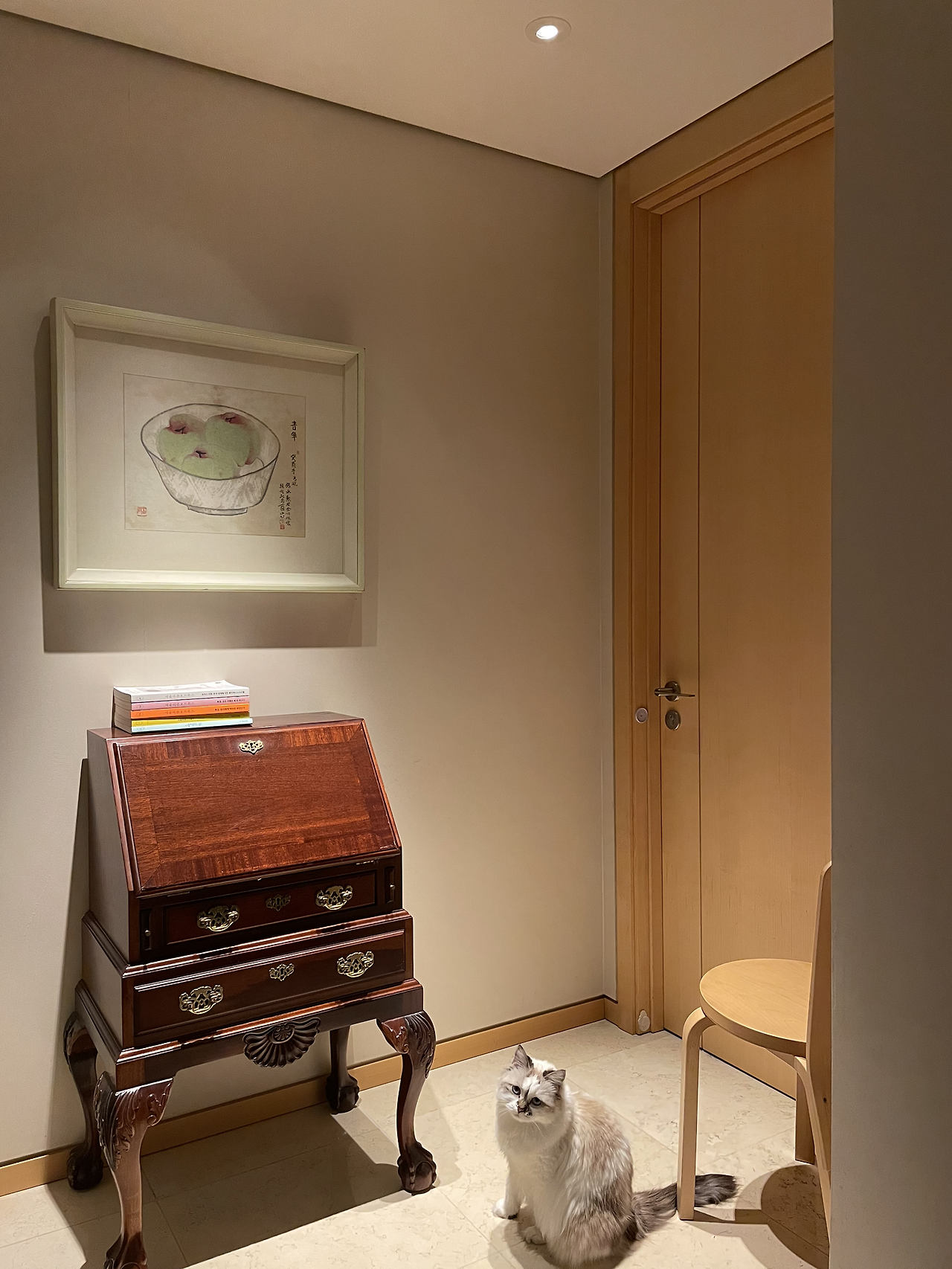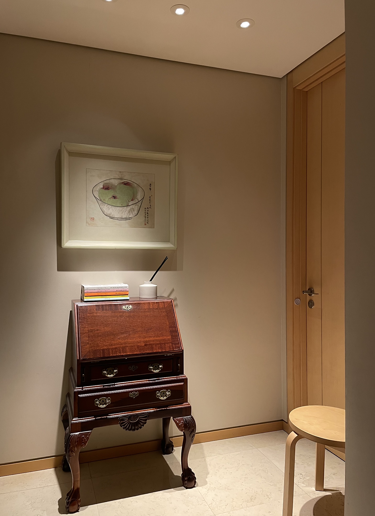 얼마 전 나는 문뜩 전혀 예상하지 못한 집 한구석 읽기 터를 한 곳 발견하였다. 이곳은 거실에서 안방으로 들어가는 입구 그저 지나가는 공간이다. 이곳은 지나가는 행위 외에 다른 행위는 일어나지 않는 곳이었다. 지나갈 수 있게 하는 복도의 기능적 공간이자 액자가 걸린 시각적 공간이었다. 그렇게 이 집에 18년을 살고 있는 동안 이곳은 그렇게만 쓰였다. 그러나 어느 날 캄캄한 새벽 이곳의 불을 켜면서 새로운 공간으로 발견되었다. 그저 지나가는 공간인데 공간의 크기와 자주 켜지 않는 스폿 조명이 이리 쓰임새가 좋을 줄이야. 유레카! 정말 집중되는 깔끔한 공간이었다.