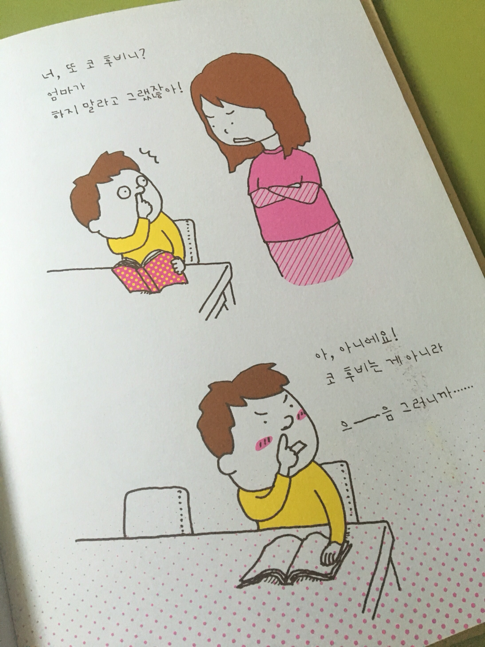 코딱지를 파다가 엄마에게 걸려요.