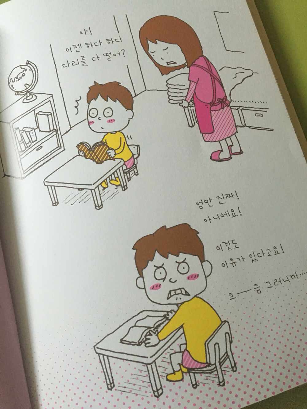 이번에는 다리를 떨다가 엄마에게 들켰습니다.