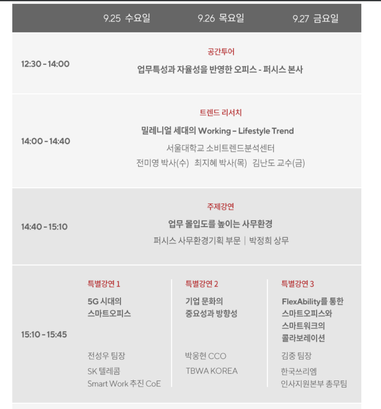 두번째 세션은 퍼시스 박정희 상무의 사무환경에 대한 강의였다. 앞에서 '세대변화'를 이야기했다면 두번째는 정말로 궁금한 '그래서 어떤걸 어떻게 도입했느냐'란 의문인데, 생생한 경험을 들을 수 있었다.