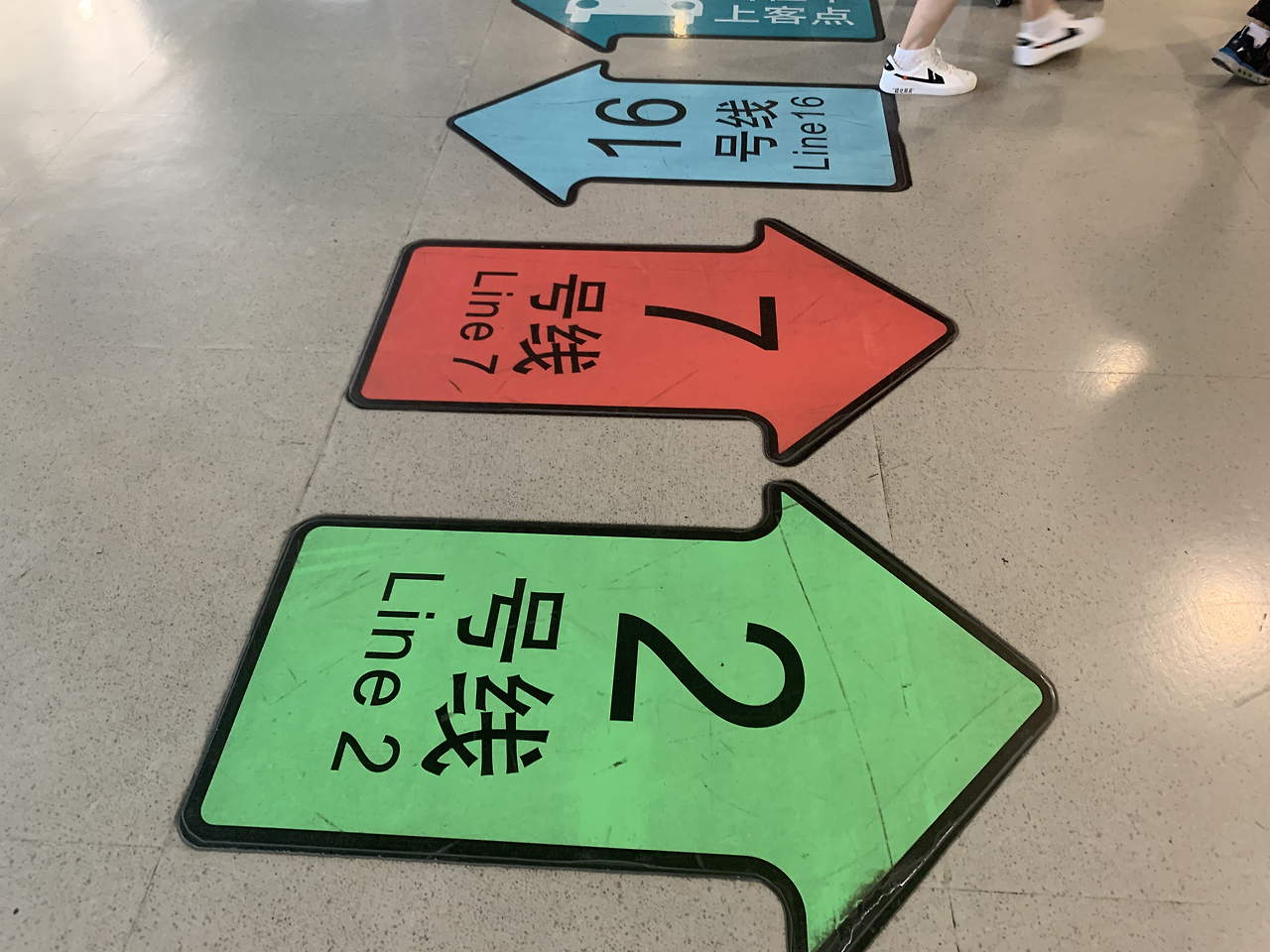 내려서 2호선으로 갈아타기 위해 이동. 친절하게 바닥에 초록색으로 2호선이 표시. 우리나라와 같다.