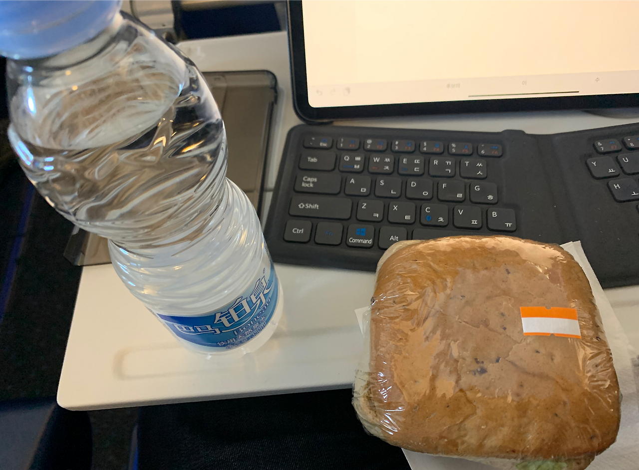 기내식은 기대하지 않았지만... 한 입 물고 내려놨다. 커피 그런건 없다.