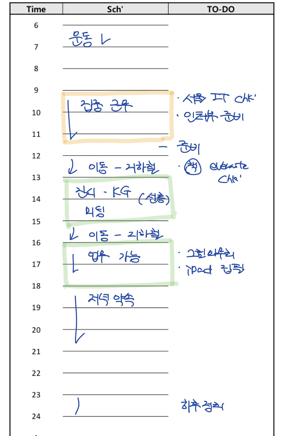 24시간 데일리 시트를 준비한 뒤. 오늘 미팅 일정이 있거나 회의 일정이 있거나 누군가를 만나는 일정이 있다면 그 시간을 블록으로 표시한다.