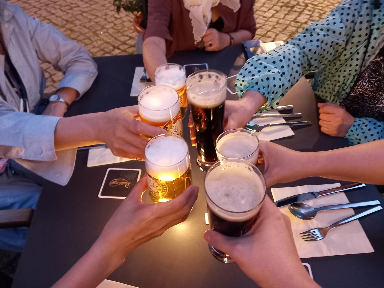 저녁 아니 밤에 야외에서 독일음악여행 1기의 만남과 여행의 시작을 독일 맥주와 함께