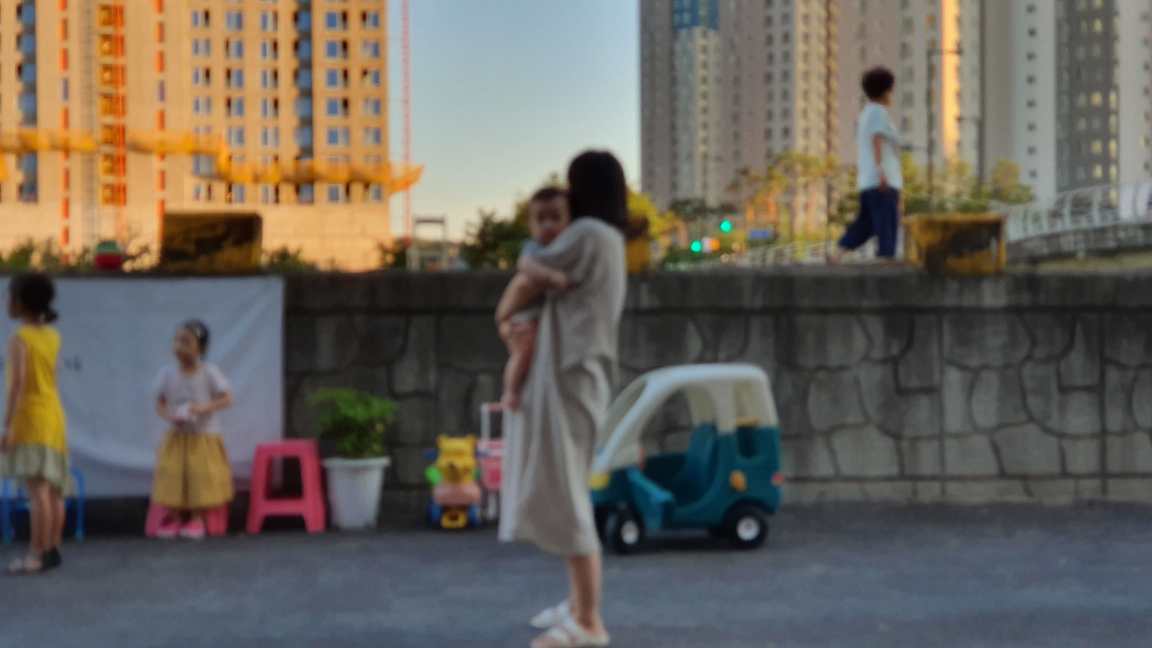 카페 앞에는 자그마하게 아이들이 놀 수 있는 공간이 있어서 부모들이 아이들을 데리고 오기 좋은 공간이다. 준이는 아직 어려서 당연히 함께 어울릴 수 없지만 또래들이 노는 모습도 보여주고 싶고, 제법 선선해진 여름 날씨를 느끼게 해주고 싶어 카페 밖으로 데리고 나갔다.