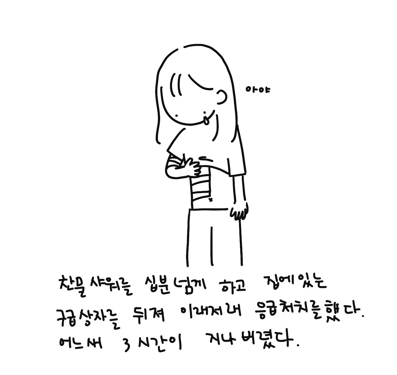 잠자리에 누워 따끔하고 쓰라린 상처를 느낄 때 이제 다시 커피를 든 채 얼음을 꺼내지 않겠다는 교훈으로 마무리해봅니다.
