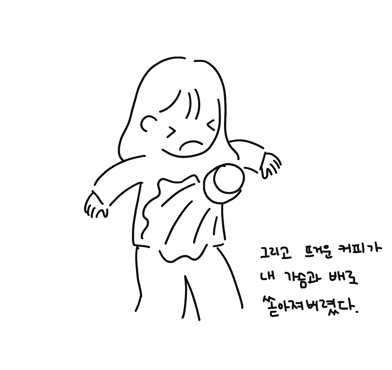 일반 머그에 얼음을 넣다 얼음이 미끄러지면서 컵을 놓치고 그만 뜨거운 물이 가슴과 배로 쏟아져 버렸습니다.