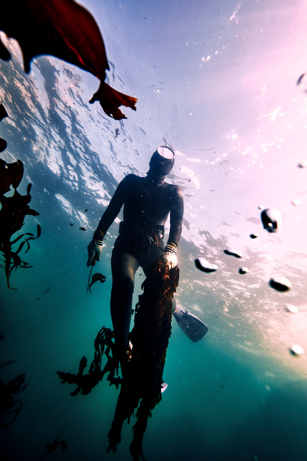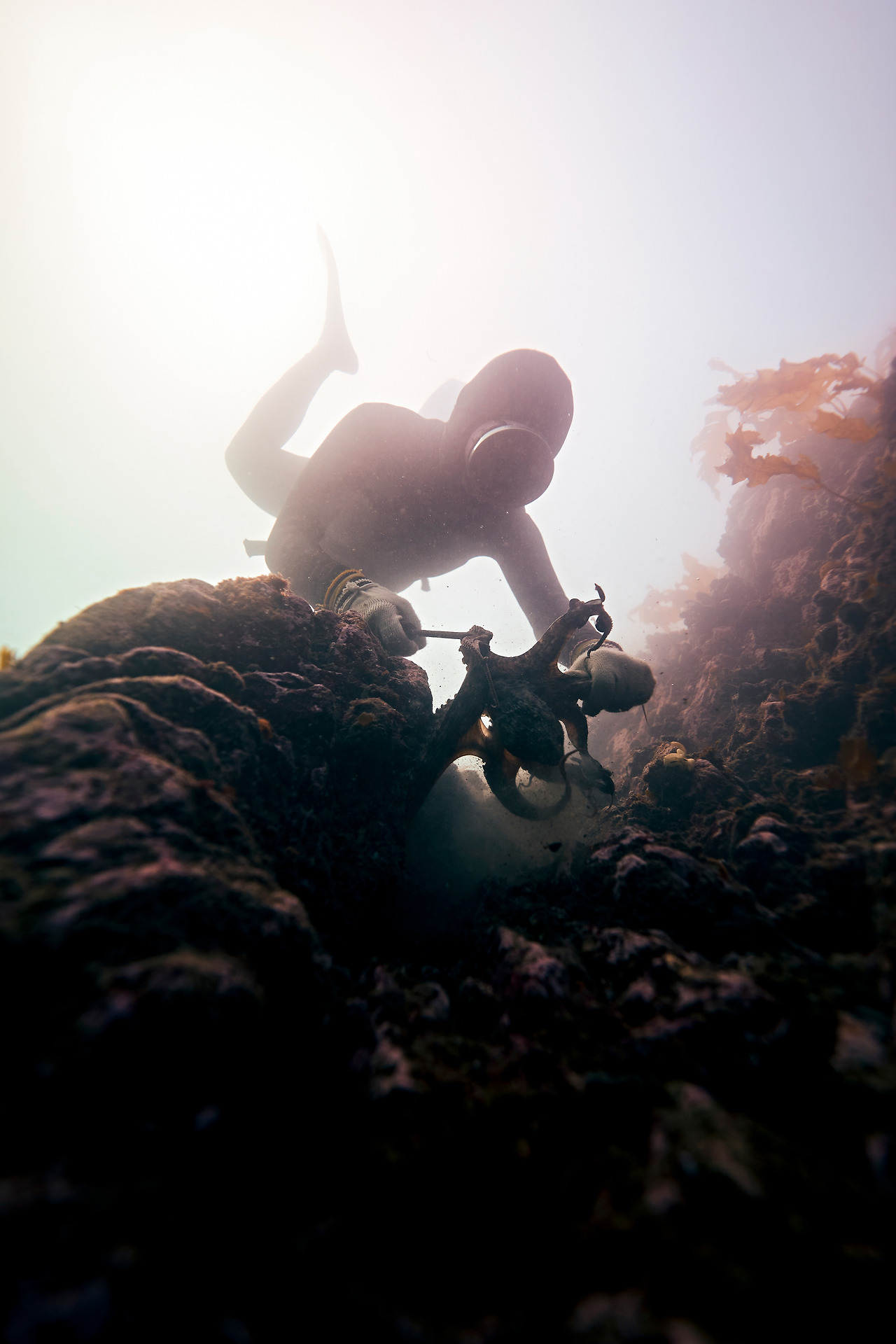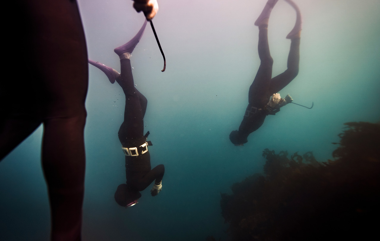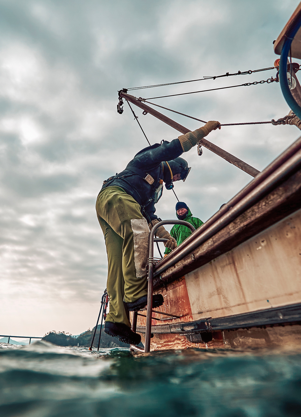 수심 25-35m의 깊은 바다에서 조개를 건져 올리는 일은 생각보다 고된 작업이다. 등에 35kg의 추를 짊어지고 가슴에 단 조명 하나에 의지해 앞이 보이지 않는 바닷속을 헤쳐나가야 하는 것. 조개를 채취하는 배는 선장과 잠수사 2인 1조가 되어 서로의 생계와 생명을 책임진다. 노란색 줄은 숨을 쉬게 하는 공기관과 배 위와 소통하는 전선 줄이고 검은색 줄은 조개를 잡을 때 쓰는 분사기다. 마치 생명을 잇는 탯줄 같다.