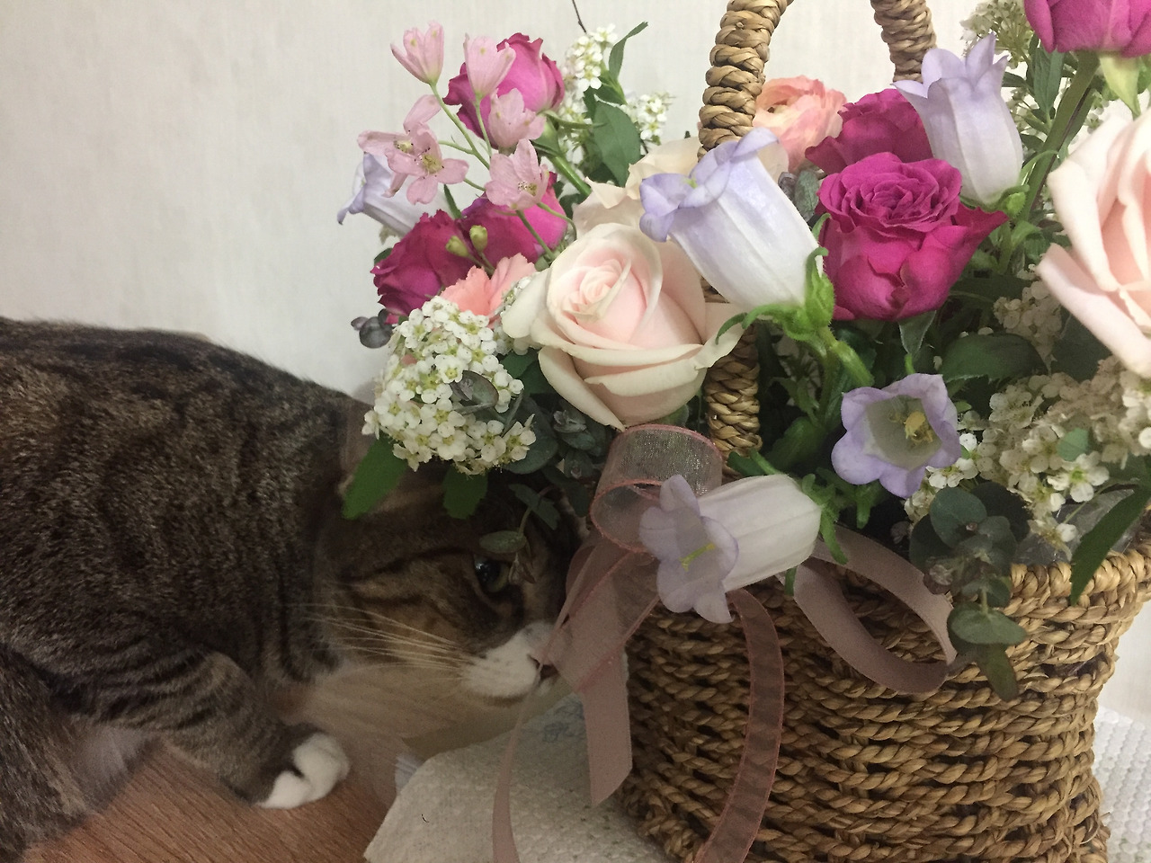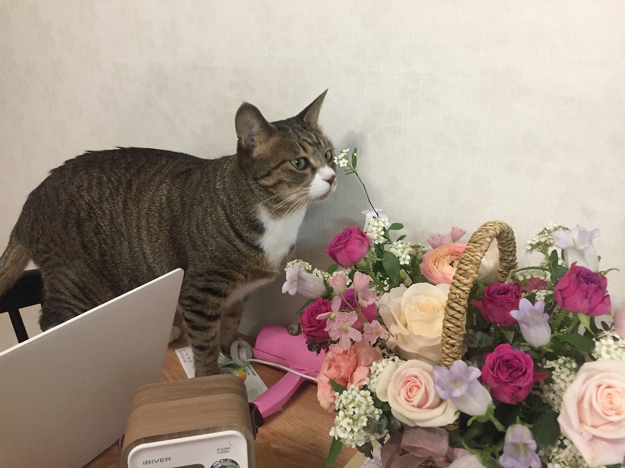 탁자 위에 올려둔 꽃바구니를 보더니 고양이들이 기웃거리고, 향기도 맡아보며 관심을 보이기 시작했다. 혹시 꽃을 물어뜯거나, 손으로 톡톡 건드려 바구니를 밀면 어쩌나 하고 잠깐 바라봤다. 다행히 걱정할만한 일은 일어나지 않았다.