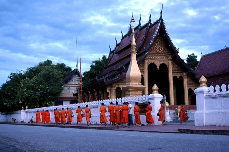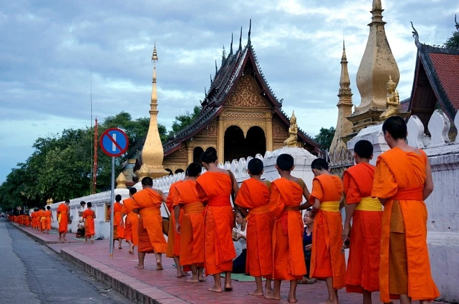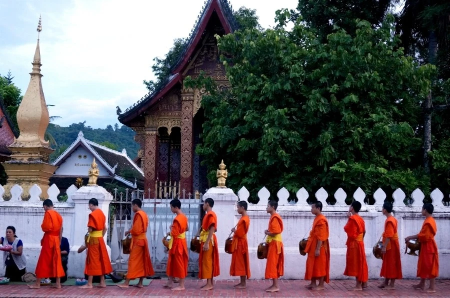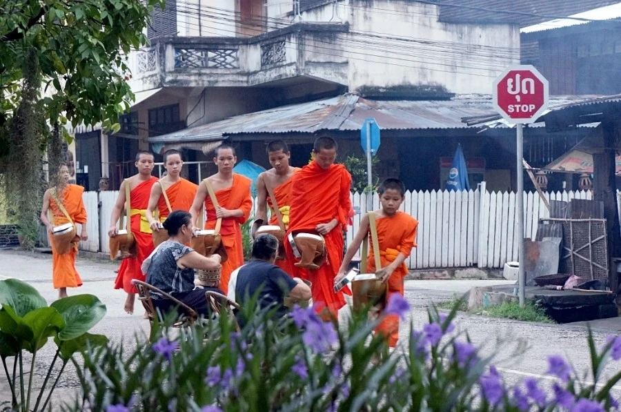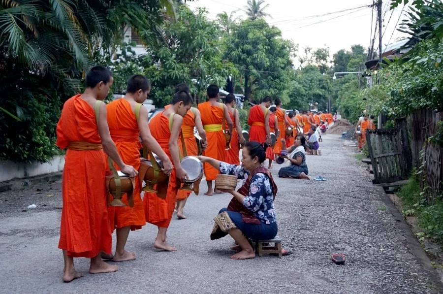 머리를 정갈하게 올린 아지매들이 골목으로 나와 자리를 잡고 딱밧 (탁발 수행)을 기다린다. 루앙프라방의 아침은 딱밧으로 시작한다. 탁발수행은 라오스에서 650년 동안 이어져 내려오고 있는 불교의식이다. 저 멀리 승려들의 행렬이 보이기 시작하더니 어느새 골목은 주황물결이 넘실거린다. 수백 명의 승려들이 맨발로 줄지어 지나는 행렬이 장관을 이룬다.