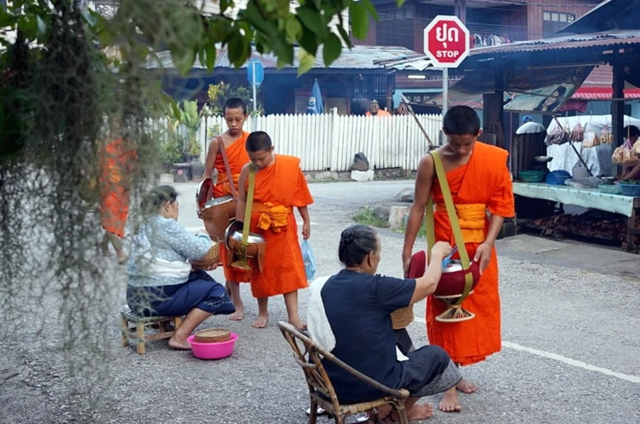 탁발은 매일 아침, 해 뜨는 시간 (보통 6시)에 시작한다. 동네 사람들은 신발을 벗고 무릎을 꿇거나 낮은 의자에 앉아 시주를 한다. 여행자의 경우에도 현지인처럼 신발을 벗고 무릎을 꿇고 하면된다.