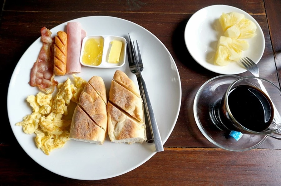 여행자의 아침식사도 단출하다. 따뜻한 바게트 빵과 계란, 햄, 베이컨 소시지, 파인애플로도 충분하다.