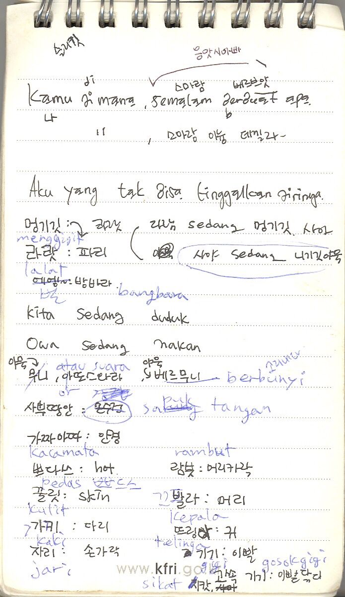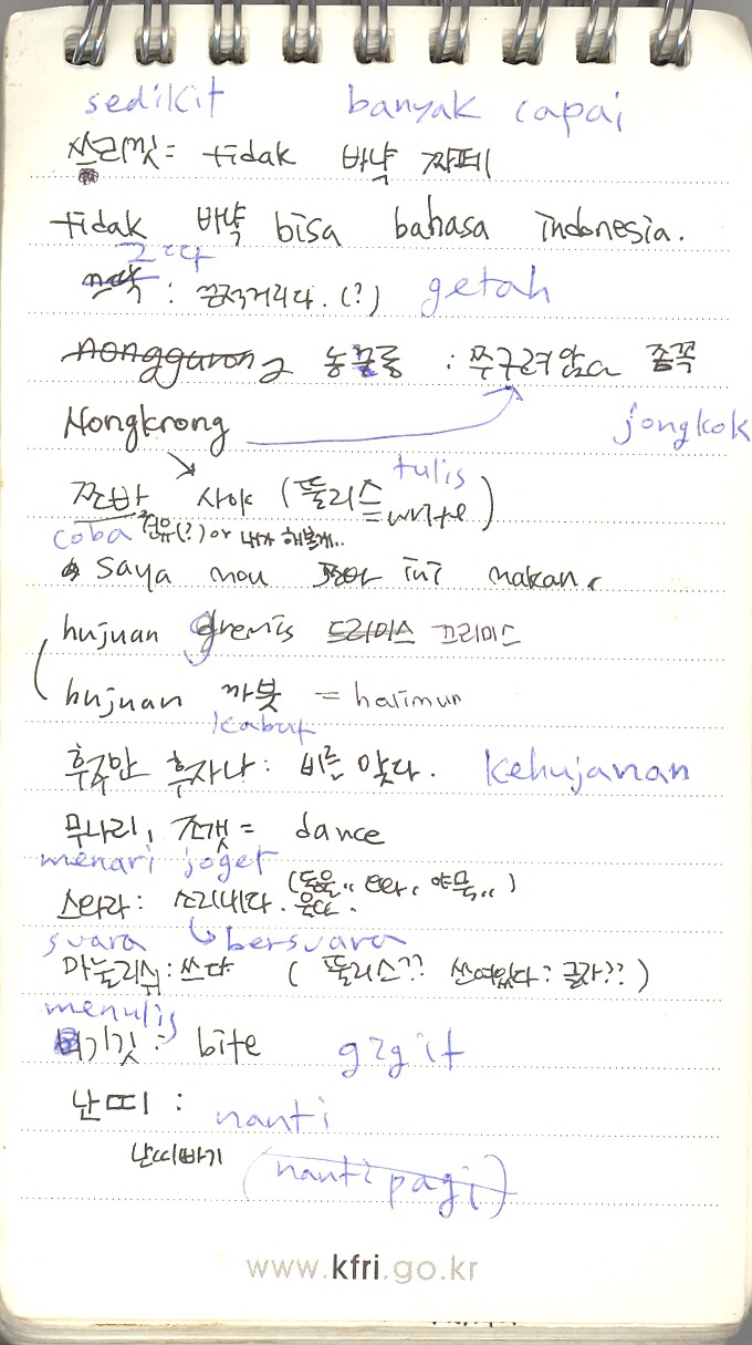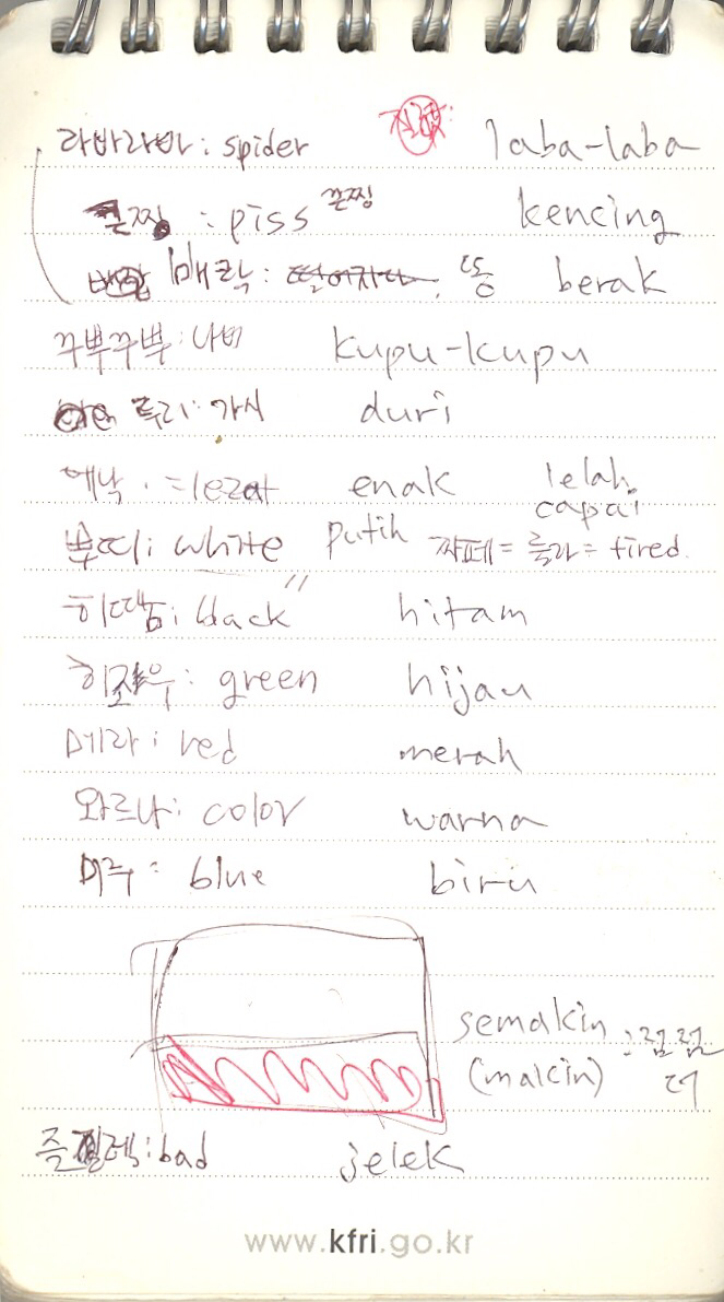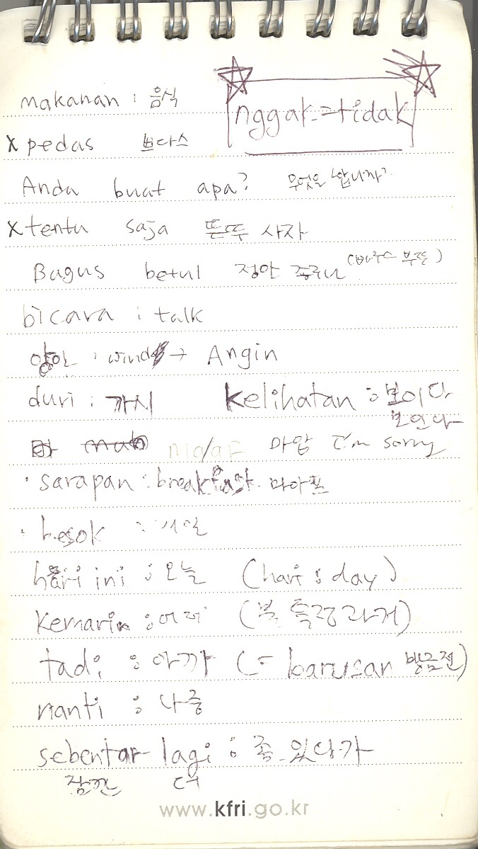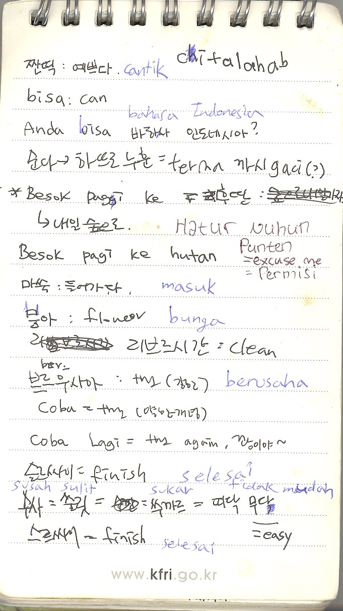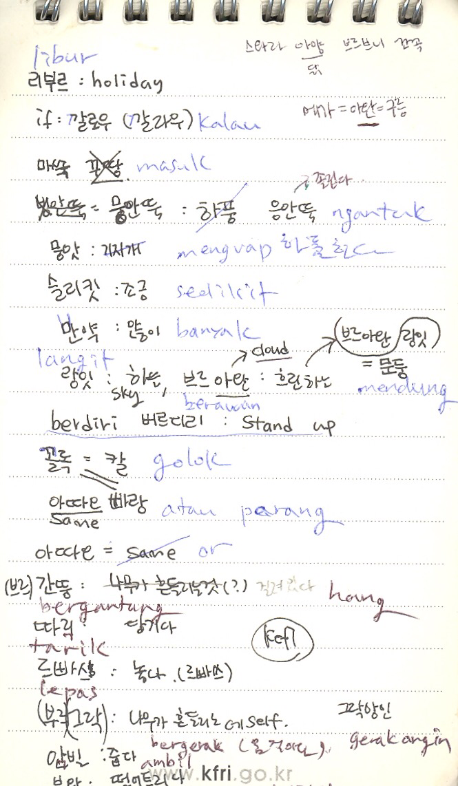 한국에서 온라인 강의를 들으면서 홀로 공부를 해보았지만 부족했었던 것 같습니다. 그래서 제가 선택한 방법은 실험에 필요한 필수단어들 외에 Aris, Nui, Sahri가 했던 말들을 한국말로 적었다가 저녁에 인도네시아어 사전을 뒤적이며 다 적어 넣는 것이었습니다. 너무 피곤한 날은 주말로 미루기도 했지만 새롭게 듣게 된 단어들은 꼭 사전에서 찾아서 알고자 했습니다. 예를 들어 "후잔"이란 말을 들으면 H로 시작하는 단어들을 찾아보면서 그 단어를 말했을 상황들을 생각하며 적합한 뜻을 찾았습니다. 찾은 단어들은 Nui의 도움을 받아 확인하며 정정해 나갔습니다.