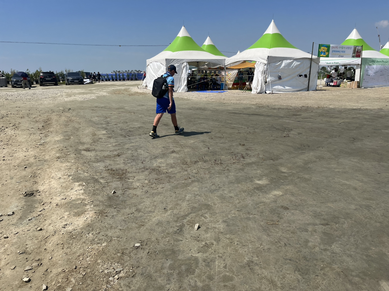 오전 열한 시 반쯤 도착했는데 지열이 이글이글 올라온다. 다행히 출입구에 생수가 쌓여있다. 일단 겉으로는 뉴스에서 보던 것만큼 물이 없어 절망적인 상황은 아닌 듯하다. 꽤 자세한 짐 검사를 하고 입장한다. 저 멀리 나라별 부스가 보인다. 바닥은 젖었다가 겉만 대충 마른 두루마리 휴지처럼 애매하게 질퍽하다. 만일 비가 온다면 정말로 큰일일 것 같다. 후텁지근한데 짠 내가 난다. 약간 물고기 썩은 것 같은 냄새다.