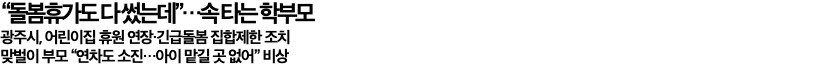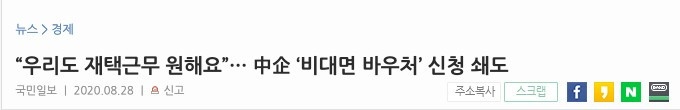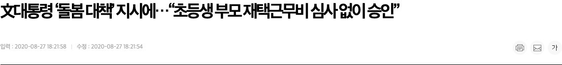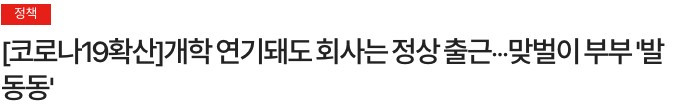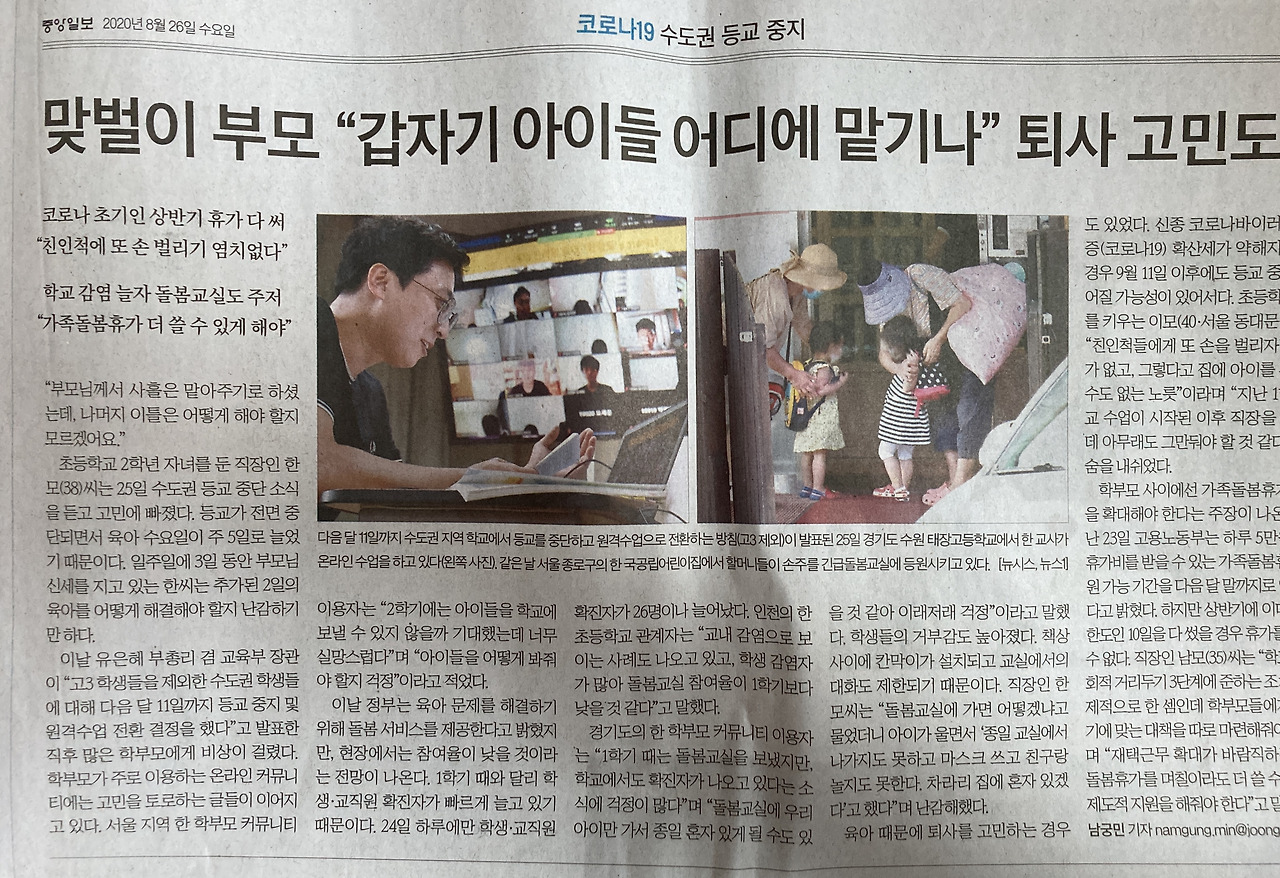 어느 누구에게도 탓을 돌릴 수 없는 이 현실도 너무 안타깝다. 그럼에도 맞벌이 부모도 아이를 안전하게 돌볼 수 있는 조치는 꼭 필요하다. 현재로서는 재택근무 밖에 대안이 없어 보인다. 그러나 대기업인 삼성, LG도 희망자에 한해 혹은 30% 정도만 이를 수용하고 있다는 기사가 어제 나왔을 뿐, 대기업도 3월의 경우보다는 좀 더 대처가 늦는 느낌을 지울 수 없다. (재택근무를 뉴스에 검색하면 대부분 2~3월 기사고 최근 기사는 거의 검색되지 않는다.) 맞벌이 부부를 위한 실질적인 대안이 매우 시급하다.