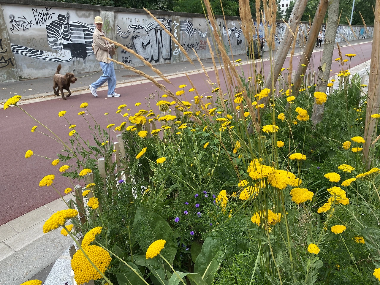 넓은 자전거 도로를 따라 노란 아킬레아가 핀 작은 화단이 이어졌다. 서양톱풀이라고도 불리는 이 꽃들이 평온한 산책길을 만들고 있었다. 안톤 벤야 공원에서는 키 큰 플라타너스와 물푸레나무들이 바람에 격렬히 흔들렸다.