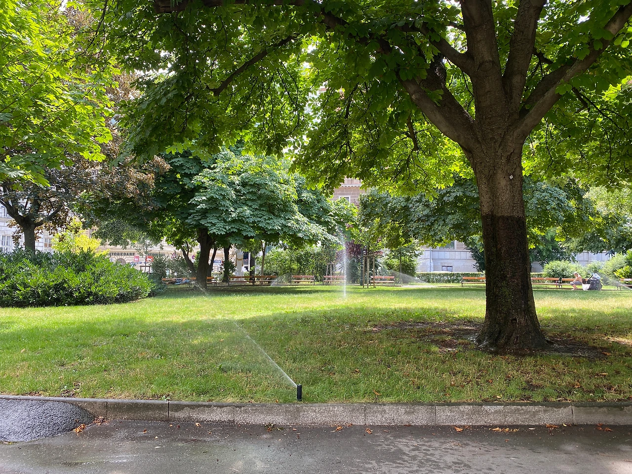 시원한 물줄기가 반원을 그리며 초록 잔디와 커다란 나무들을 적셨고, 나무들은 그 물줄기를 간절히 기다리고 있었던 것처럼 잔뜩 머금었다. 여름 한낮의 열기를 식히는 소리. 쉬이익 쉬이익, 그 리듬감마저 시원하게 들리는 물소리였다. 마침 걷느라 지친 나에게도 오아시스 같은 쉼터가 필요했다. 나무 벤치에 가방을 내려놓고 다른 여행객들처럼 자리를 잡았다. 근처에 있던 슈퍼마켓, 빌라(Billa)에서 산 샐러드와 빵, 시원한 음료수를 꺼내 벤치에 펼쳐 놓았다. 특별할 것 없는 먹거리지만 소풍 나온 아이처럼 입가엔 미소가 맴돌았다.