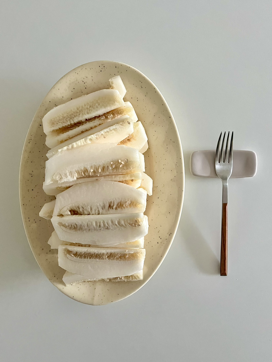 여름의 초입에는 달큼한 맛이 일품인 참외를 사둔다. 껍질을 깎아 먹는 과일은 어쩐지 손이 자주 가지 않는데도 제철과일은 그냥 지나치지 못한다. 바빠서 먹을 시간이 없다는 핑계로 미루고 미루다가 껍질이 쭈그러들기 직전에 야채박스에서 꺼내온 참외. 깨끗이 씻어 길쭉하게 자르니 달콤하고 시원한 향이 솔솔 난다. 한바탕 집안일을 마치고 먹으니 더욱 꿀맛이었던 주말 오후의 간식.