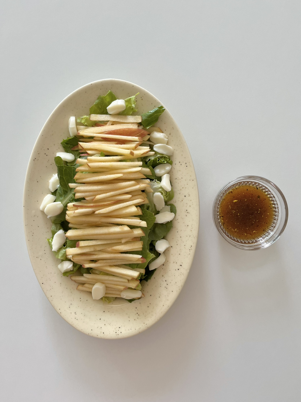 감기 기운에 시달리던 입맛을 돋우는 아삭하고 상큼한 사과 샐러드. 과일과 채소의 건강한 맛도 맛이지만, 냉장고 한편을 비웠다는 후련함이 주말 아침을 신선하게 환기시켜 준다.