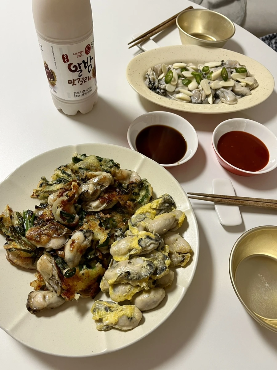 생굴 네댓 점을 꿀꺽 삼키고, 뒤집다가 다 흩어진 굴부침개를 간장에 콕콕 찍어 먹는다.