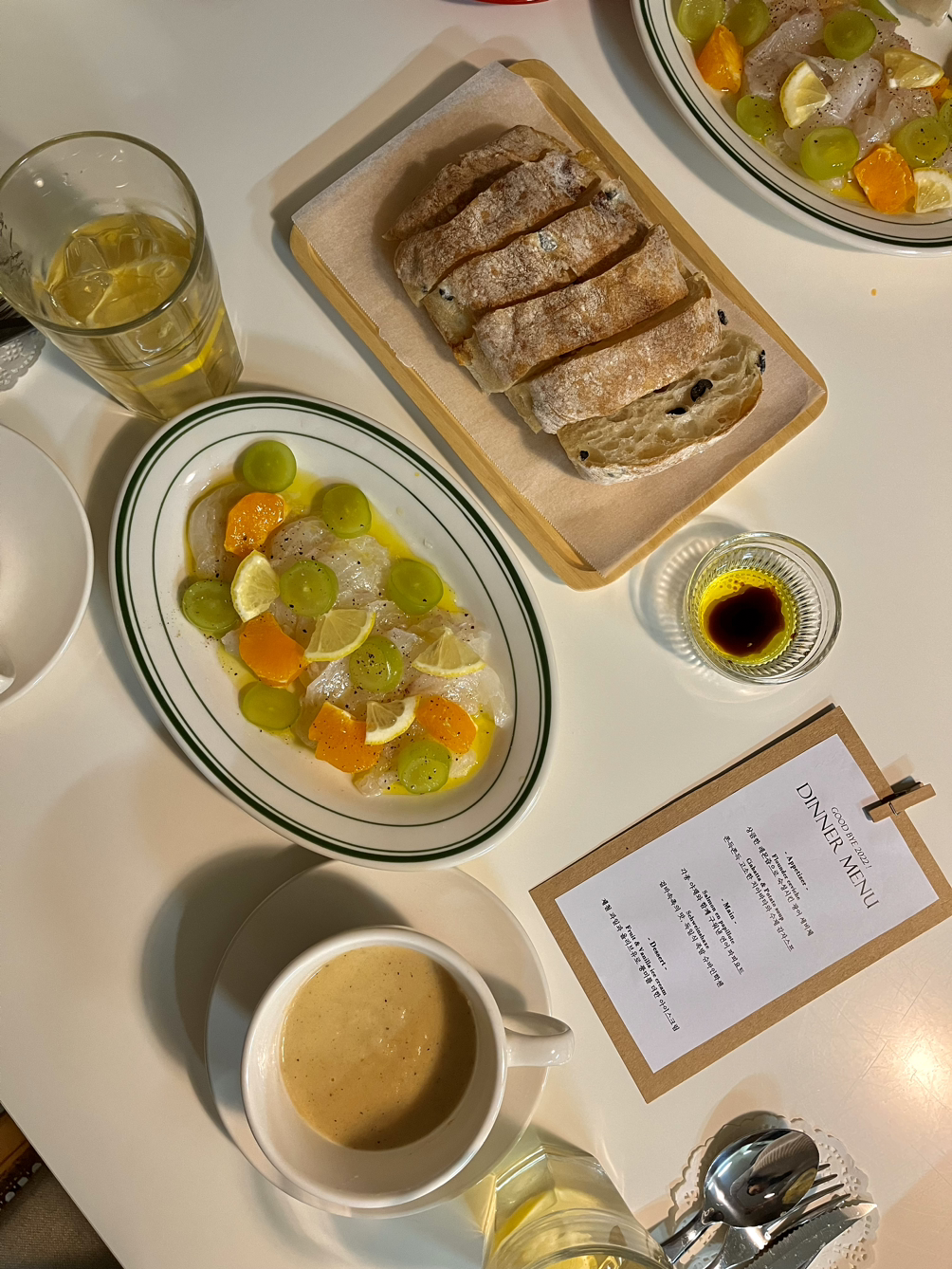 애피타이저_상큼한 레몬즙으로 숙성시킨 광어 세비체 & 쫀득쫀득 고소한 치아바타와 수제 감자수프