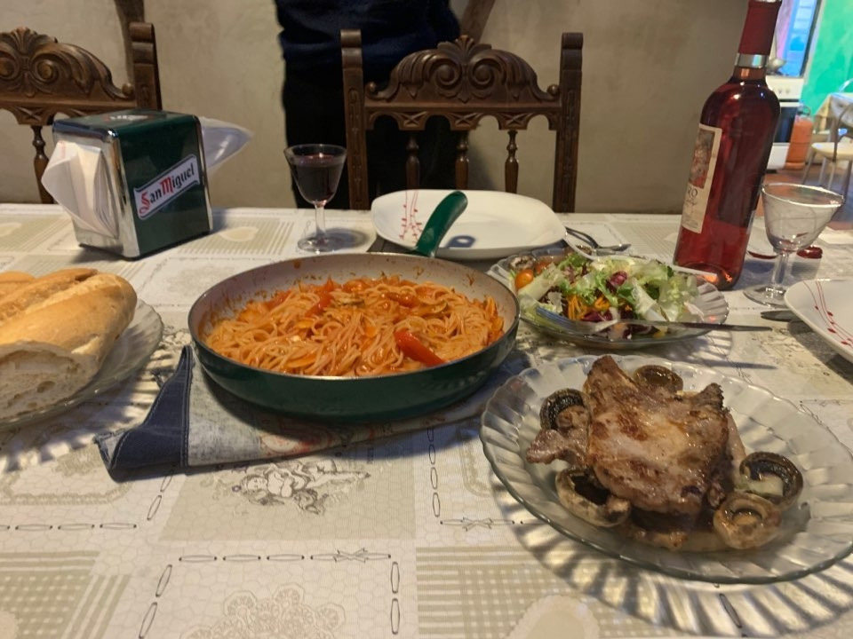 알베르게로 돌아가, 샐러드, 파스타, 돼지 등심 구이 스테이크를 했습니다. 저와 남편은 꼭 둘이 먹는 밥인데도 3~4인분은 짓게 되더라고요. 농담 삼아, ‘we should have a big family or just two big persons. 우리는 큰 가족을 이루거나, 아니면 우리가 엄청 큰 두 명이 되어야 해’라고 이야기하기도 합니다. 카스트로헤리츠에서도 역시나 많은 양을 요리하고 있었는데, 알베르게 주인이 다가와서 자연스럽게 와인을 마시며 이야기를 하고 함께 식사하게 되었습니다.