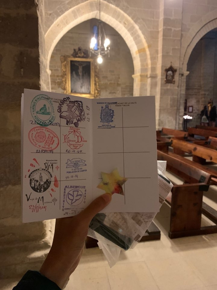 순례자 여권. 방문한 곳의 도장을 받아 추후 완주 증명한다. 이 사진의 포인트는 새까맣게 탄 손, 그리고 귀여운 종이 별 ★