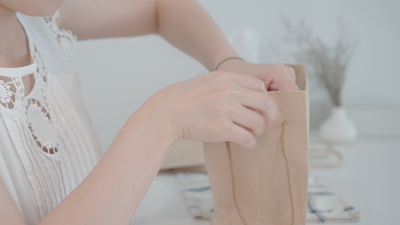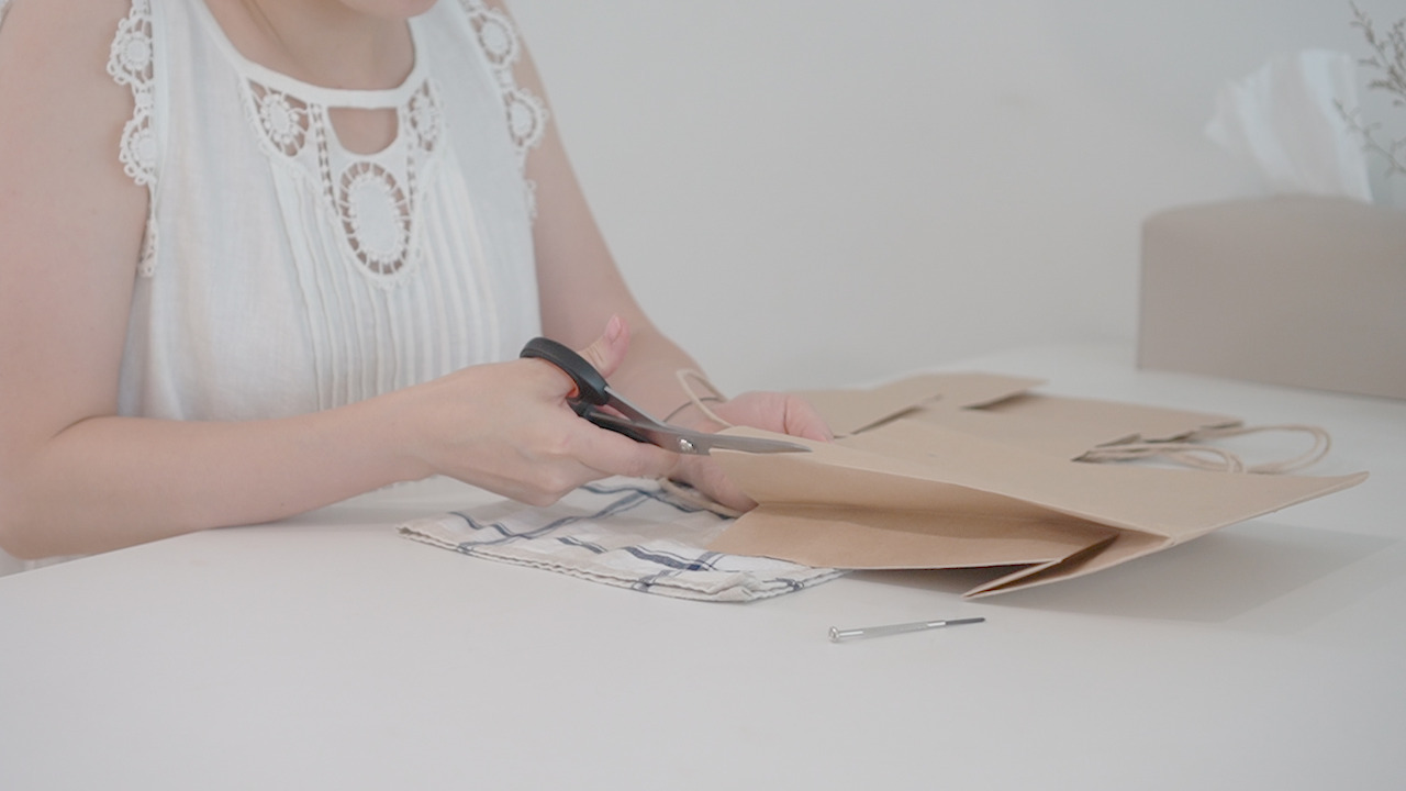 (4) 옆면에 적당한 위치에 구멍을 뚫어서 사용 안 하는 다른 쇼핑백의 끈을 이용해서 아까 뚫어준 구멍에 끈을 넣어 쇼핑백 안쪽에서 매듭지어 줍니다. (저는 종이끈 쇼핑백을 이용해서 다른 쇼핑백에 끈을 재활용했는데, 접어준 쇼핑백의 끈을 옮겨 달아 주셔도 좋아요!)