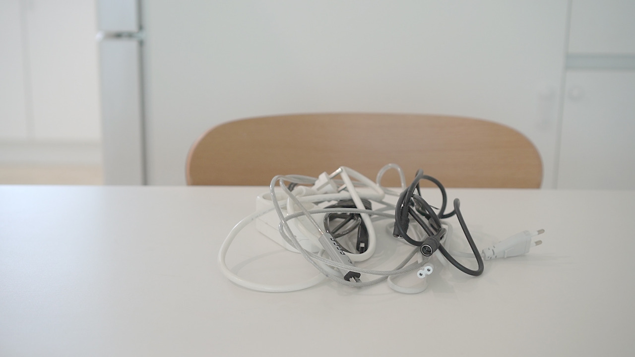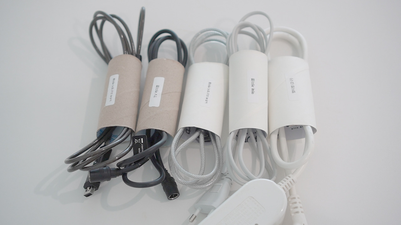 이렇게 길게 뒤엉킨 긴 코드나 전선 정리할 때는 휴지심을 활용하면 좋아요.