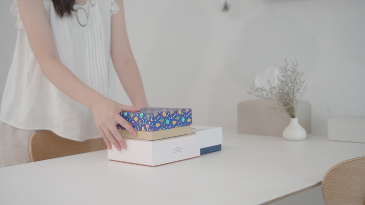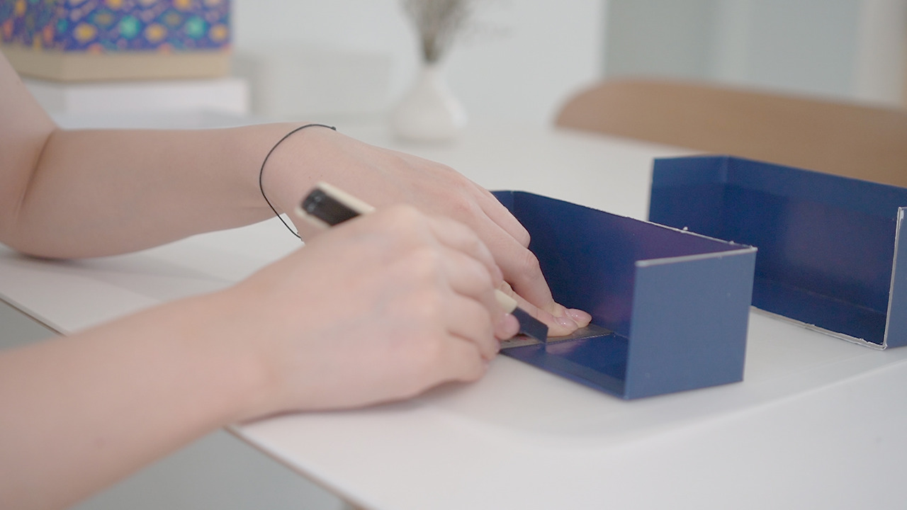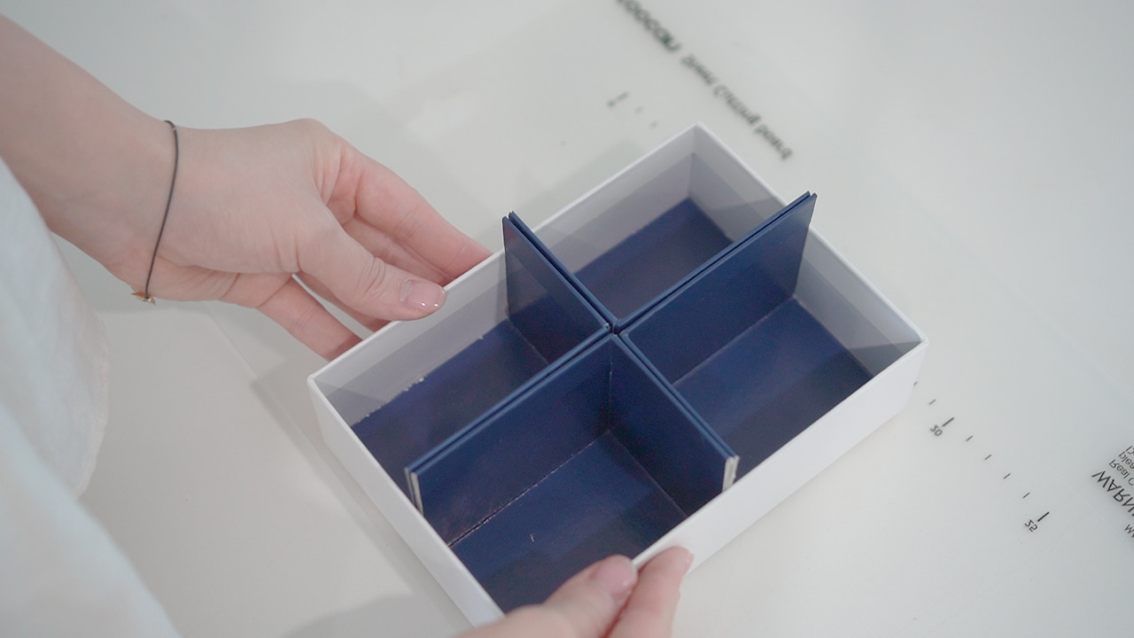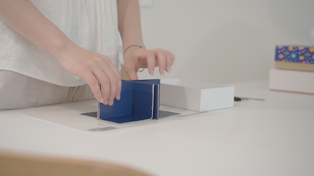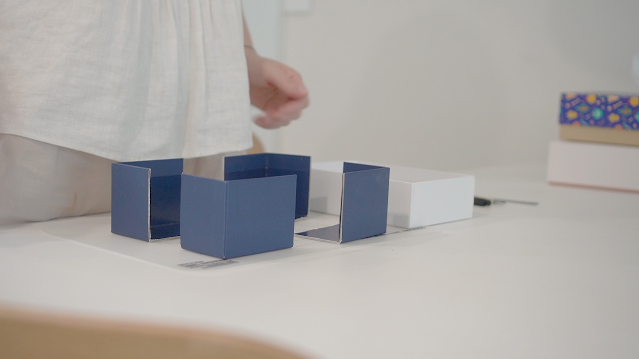이렇게 4개로 잘린 상자를 안쪽으로 방향을 돌려주고, 남은 상자 안에 쏙 넣어줍니다.