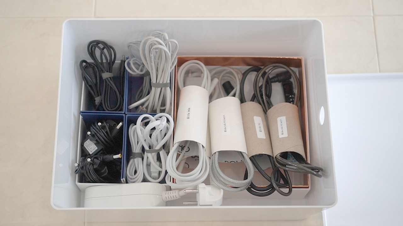 이렇게 전선을 동그랗게 말아서 휴지심에 넣어줍니다. 저는 나중에 찾기 편하도록 라벨링도 해주었습니다.