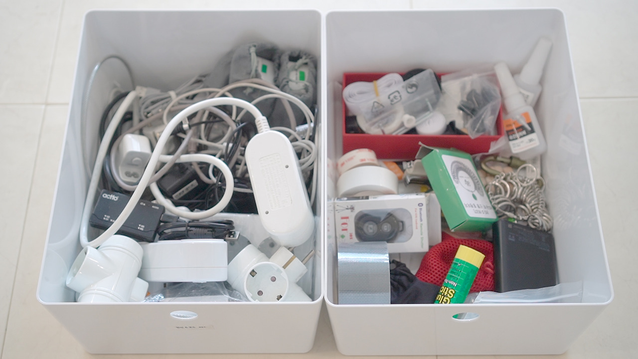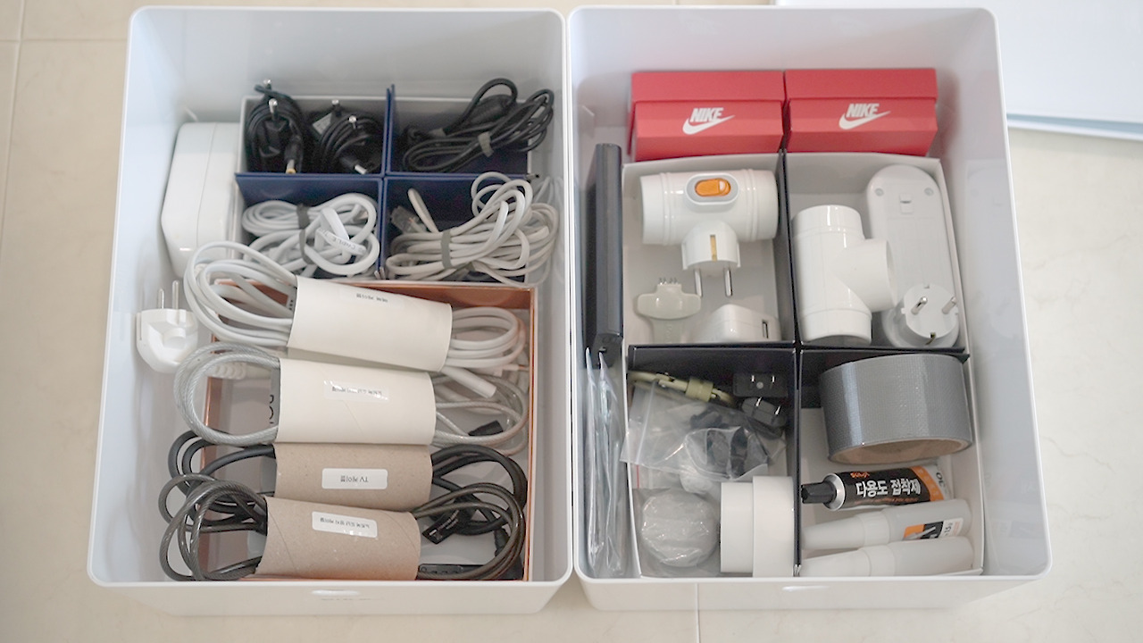 우선 저희 집에 잡동사니를 담아두는 보관함을 공개할게요. 각종 전자기기에 필요한 전선들과 공구들입니다.