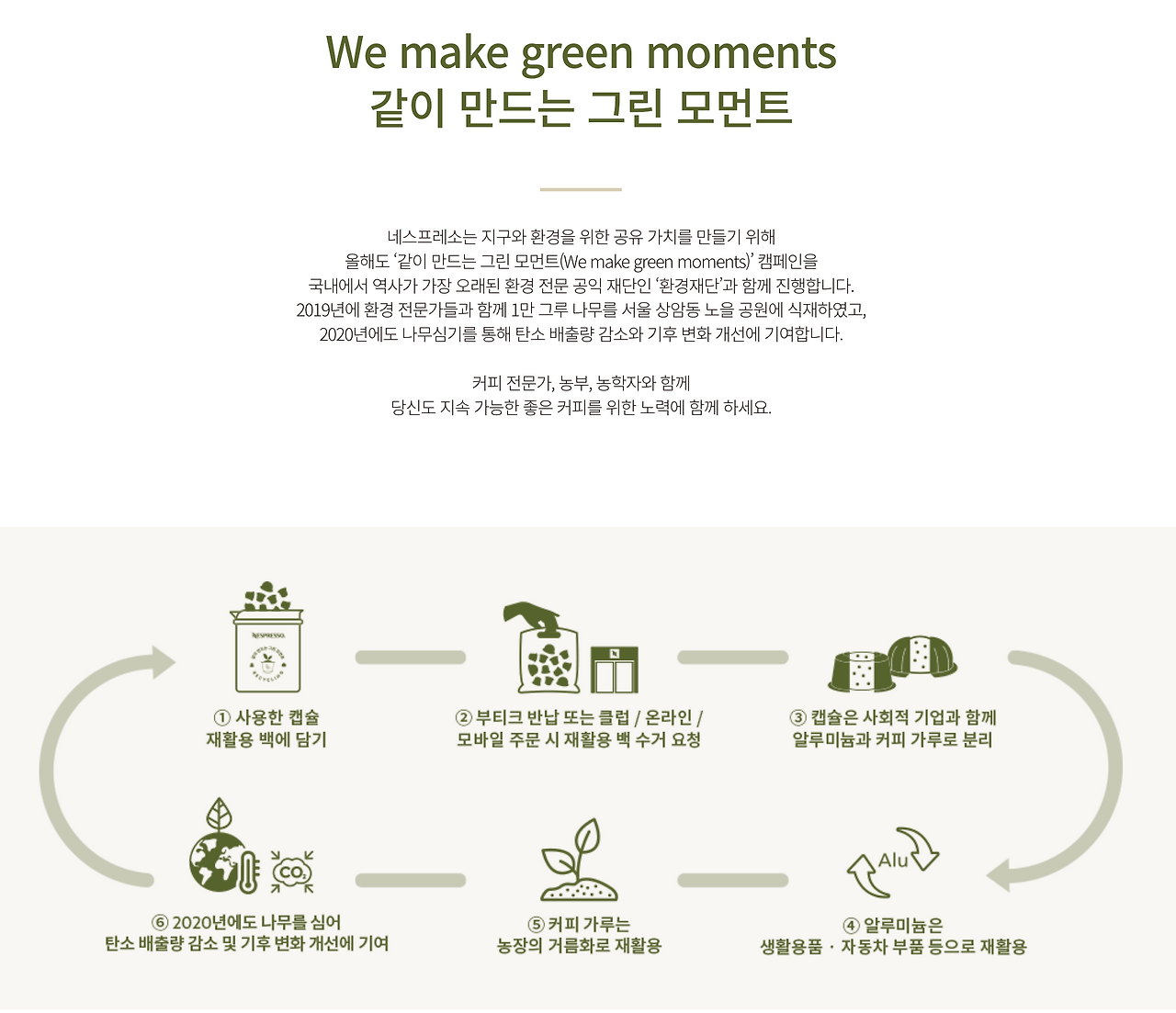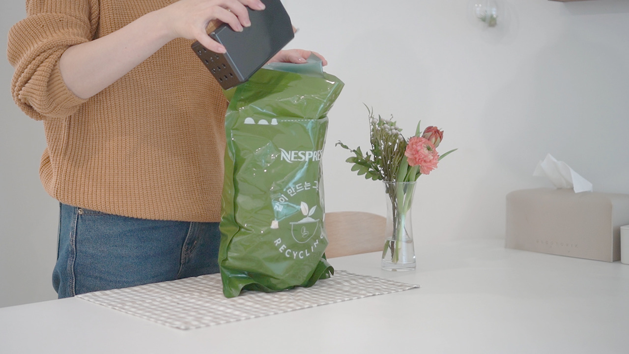 저는 네스프레소 캡슐 머신을 사용하고 있는데, 다 쓴 커피 캡슐은 전용 재활용 백에 모아서 방문수거 신청을 하곤 해요. 이렇게 수거된 캡슐은 네스프레소 본사에서 친환경적으로 재활용된다고 합니다. 참 좋은 캠페인인 것 같아요. :)