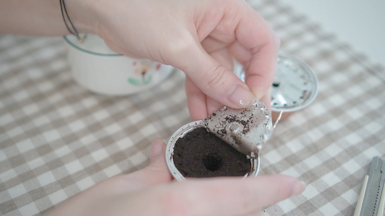 전자레인지 탈취를 위해 다 사용한 커피 캡슐 1개를 캡슐 포장을 제거해 보려고요.