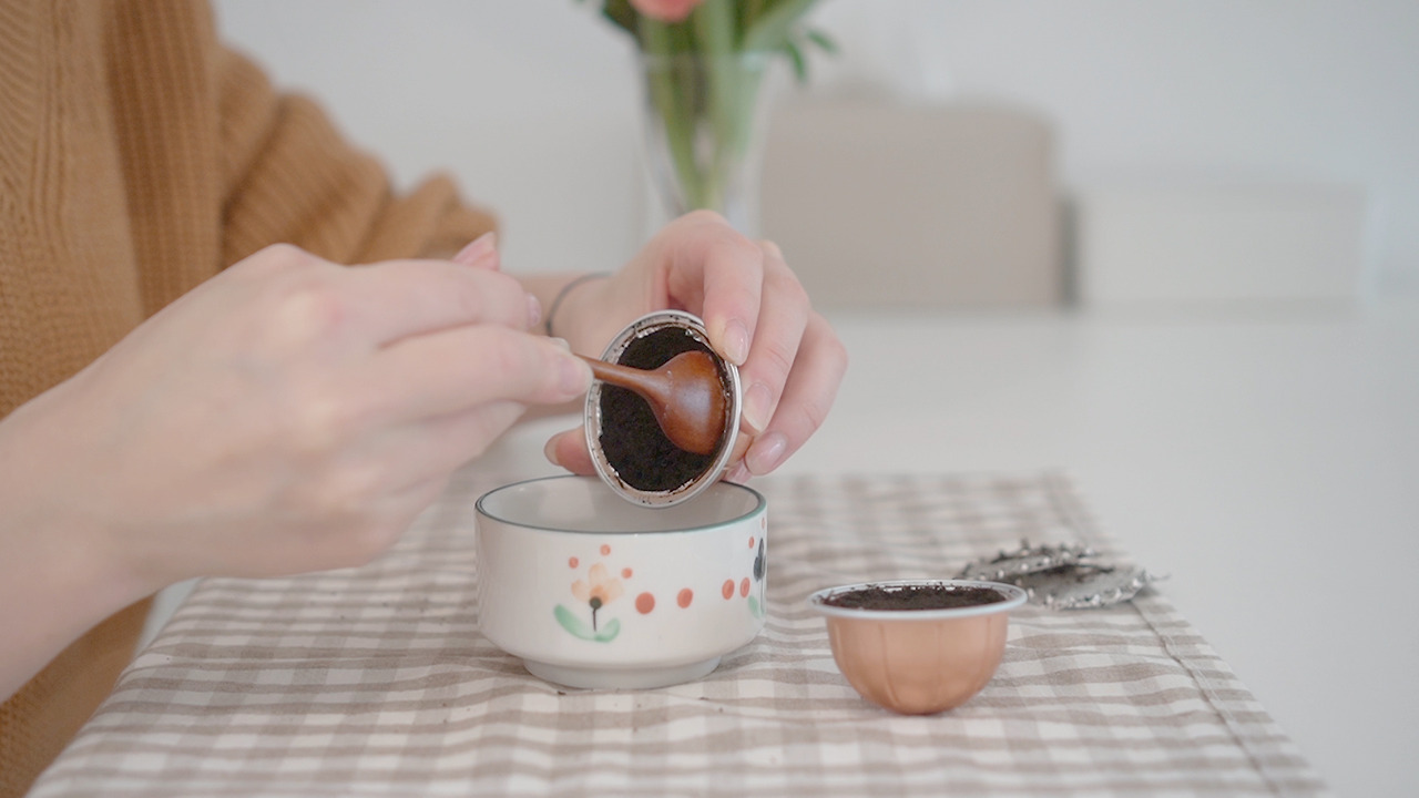 이렇게 포장을 벗겨내면 사용하고 난 커피 원두 찌꺼기가 보이죠? 이 찌꺼기 2 스푼 정도 유리그릇에 담아서