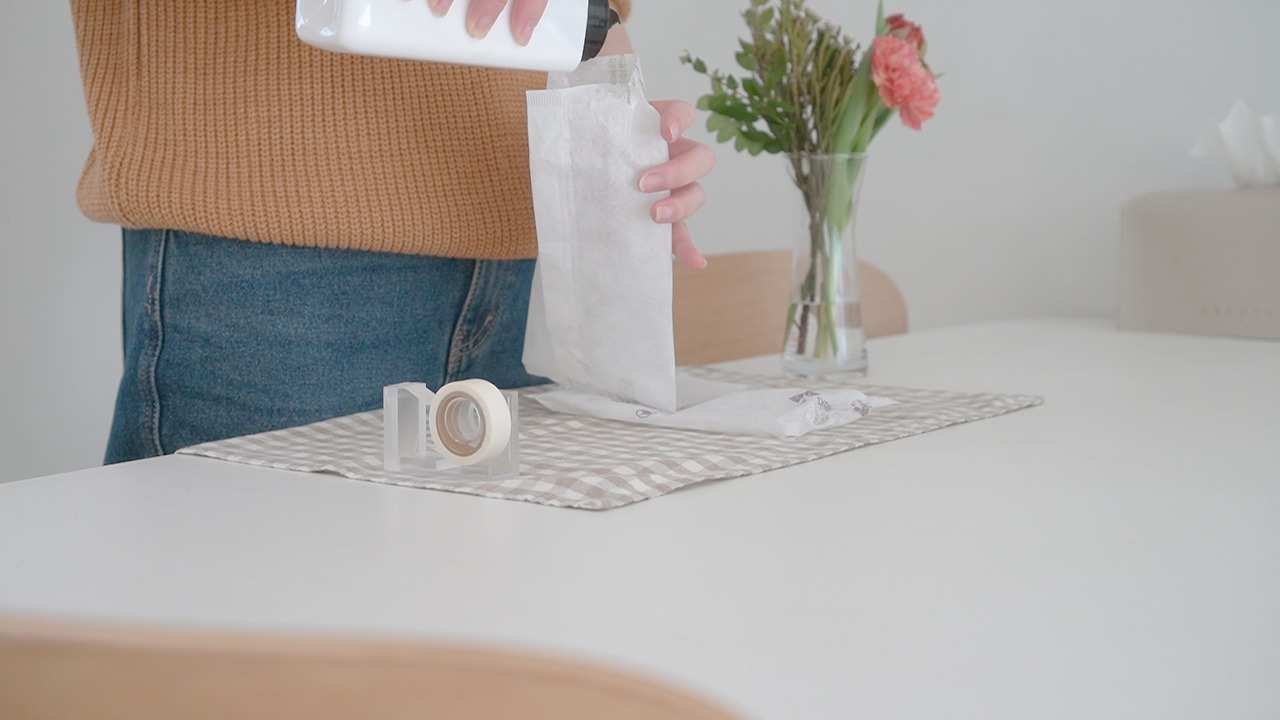 다 사용한 부직포 백에 베이킹소다를 1/3 만큼 부어줍니다. 그리고 테이프로 밀봉해 줄게요. 저는 테이프를 사용했지만 스템플러를 사용하면 더 단단하게 밀봉 수 있습니다. :)