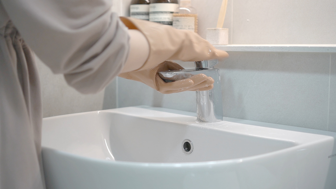 그리고 고무장갑을 낀 손으로 치약을 수전에 골고루 묻히면서 문질러 주세요.