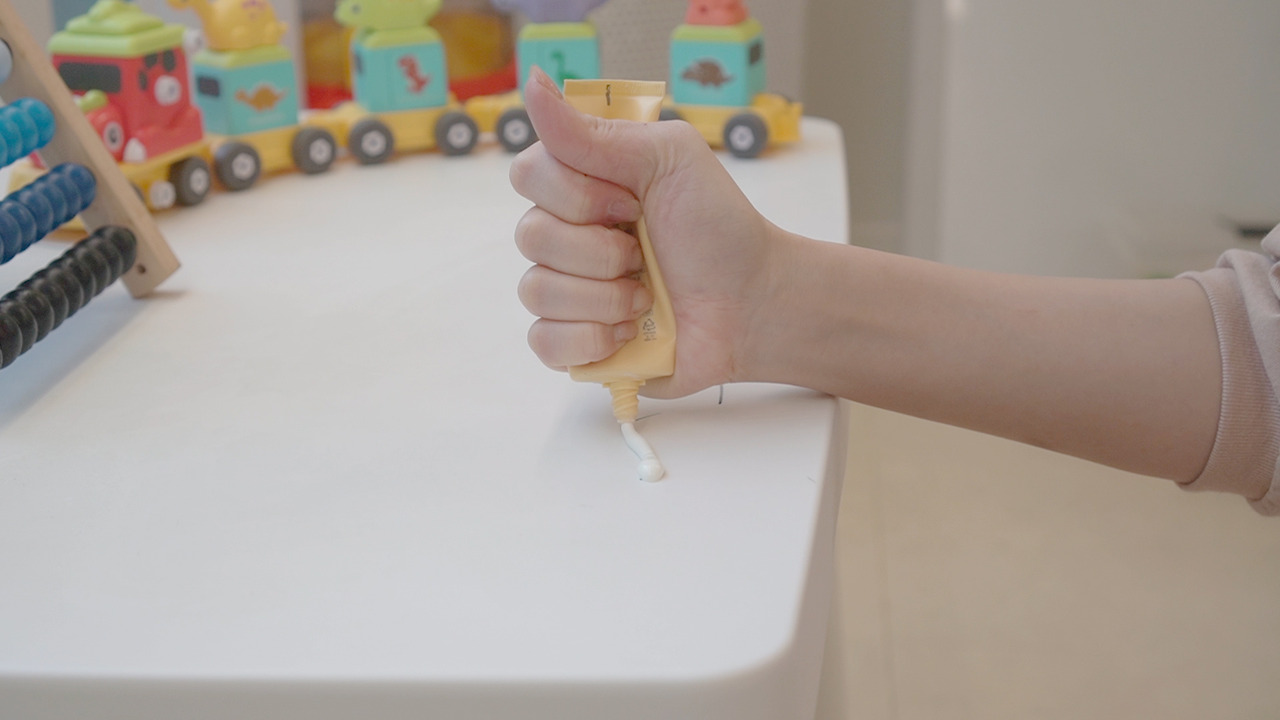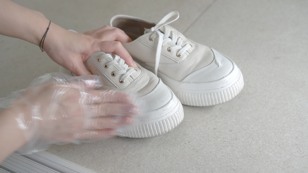 운동화 밑창에 선크림이 잘 흡수되도록 골고루 묻혀줍니다. 그리고 10분 정도 지난 후, 물티슈로 부드럽게 닦아 주세요.