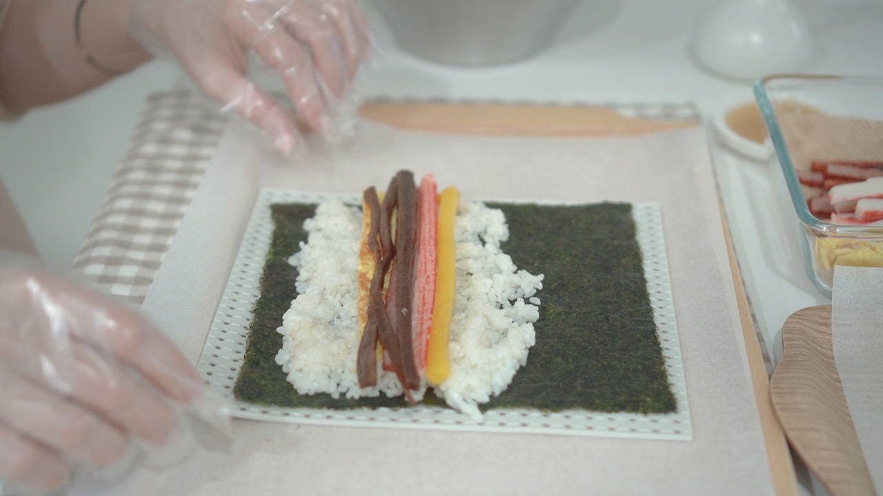 실리콘 말이 위에 김을 올려놓고 각종재료를 올려줍니다. (참고로 이때 밥을 더 넓게 깔아주는 게 나중에 김밥 모양이 이쁘게 나와요! 저는 김밥에 밥이 많은 걸 싫어하는 편이라 조금만 넣어주었어요!)