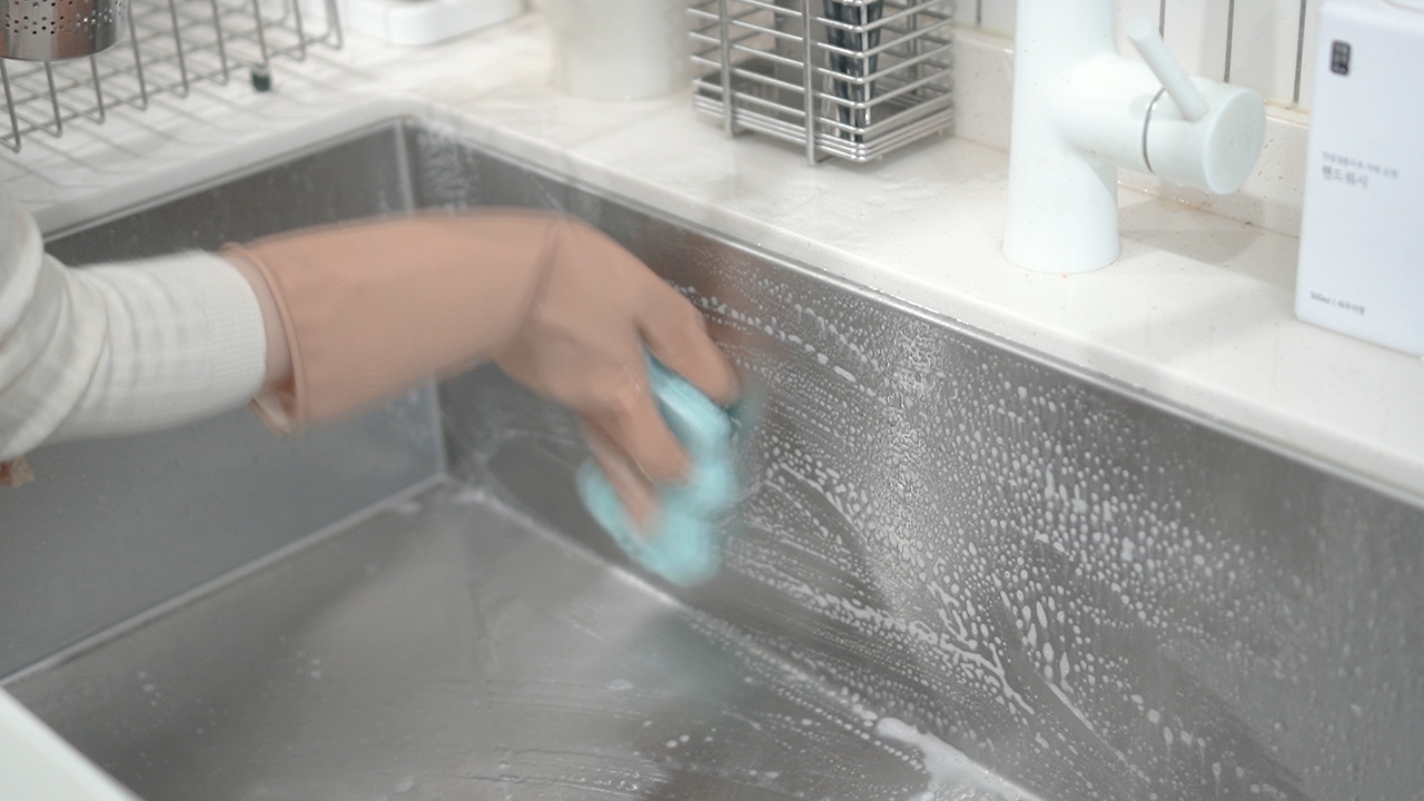 설거지 용으로 사용할 수 도 있지만 저는 비누 거치대와 싱크볼 세척할 때 주로 사용하고 있어요. 따로 세제를 사용하지 않아도 행주비누의 잔여물로 싱크볼을 닦아주면 간단하게 싱크볼 청소가 가능합니다.