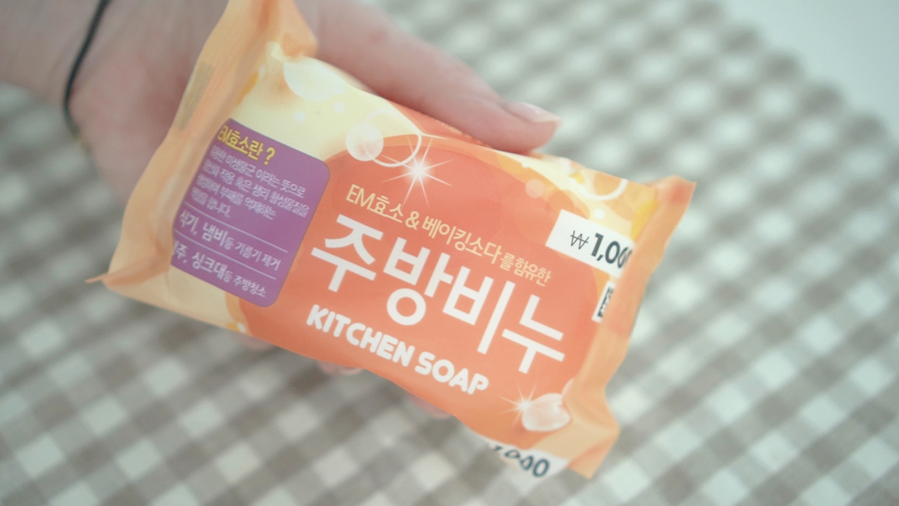 이 제품은 주방 고체비누입니다. 이 제품도 가격은 단돈 천 원. 친환경 살림을 시작하고 가장 먼저 바꾼 게 주방 비누라서 그동안 다양한 주방 고체 바를 사용해 봤는데, 이번 기회에 다이소 제품도 한번 사용해 봤어요.