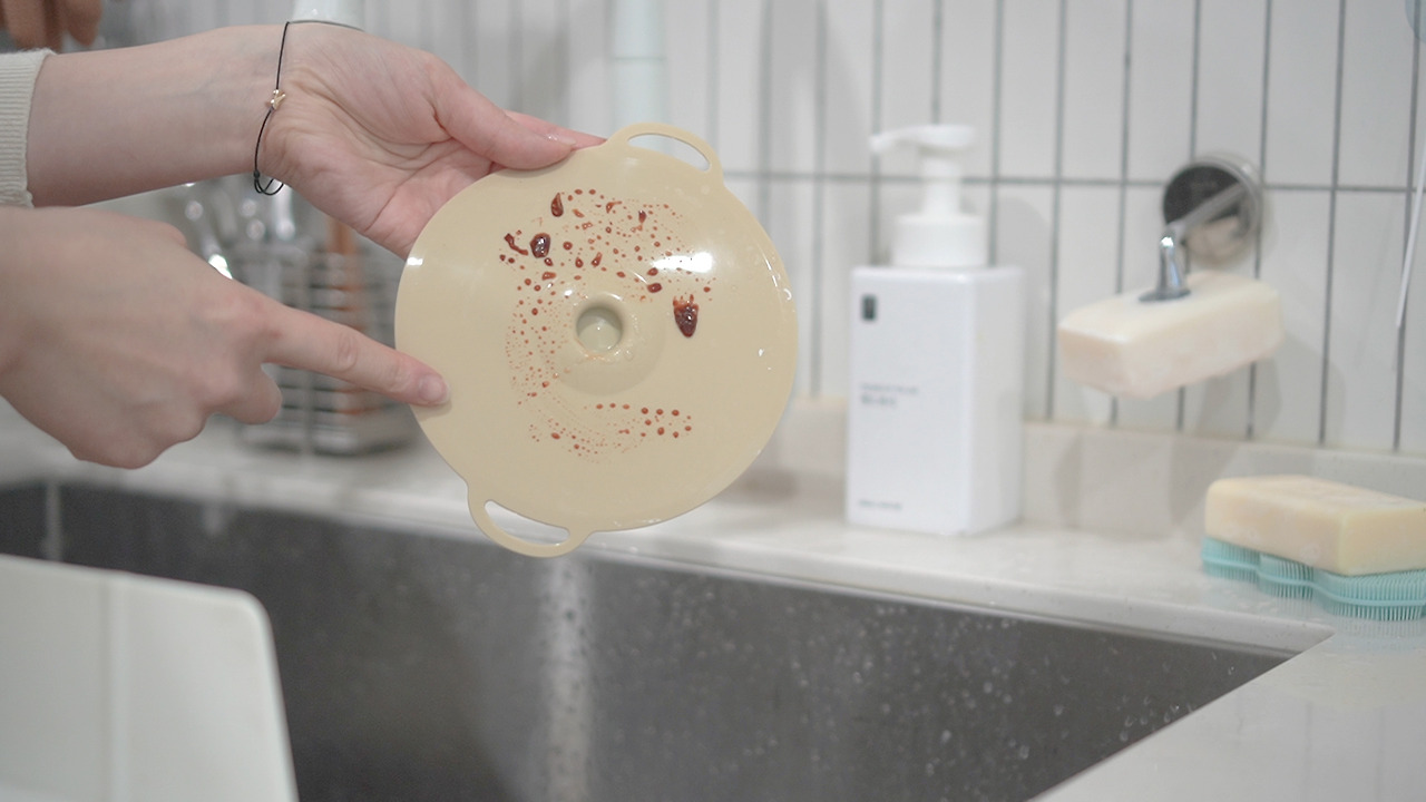 큰 사이즈 실리콘 뚜껑처럼 입구에 뚜껑을 덮고 살짝 눌러주면 밀폐가 돼서 음식물 보관에 용이하고, 안쪽에 유광 코팅이 되어 있어 물로 가볍게 씻어서 줘도 쉽게 이염되지 않아요.