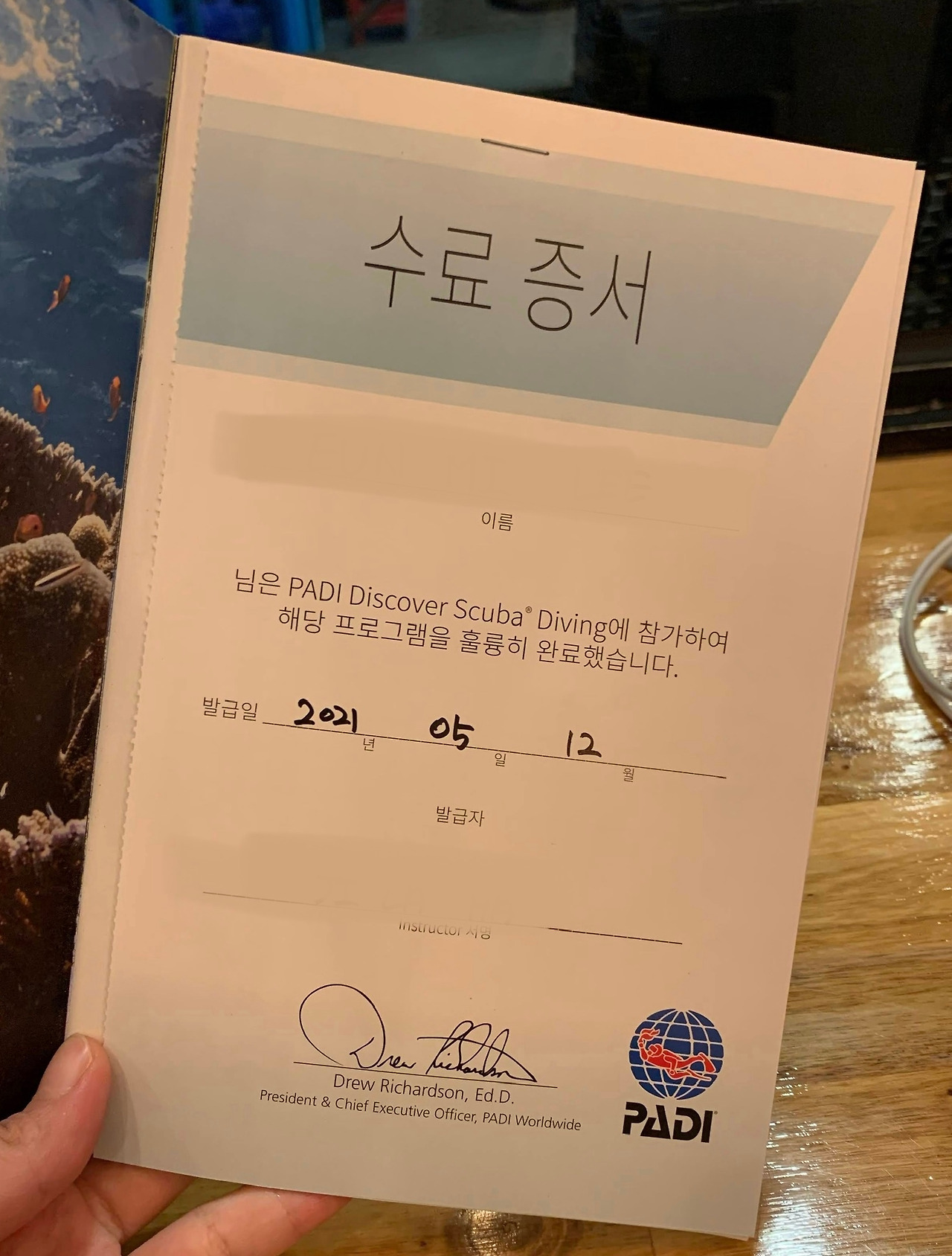 다시 센터로 돌아와서 씻고 나오자 귤을 주셔서 귤을 먹고 다이빙 증서를 받았다. 받아보니 너무 잘했다고 다이빙 신동 소리가 쓰여있어서 괜히 더 기분이 좋았다.