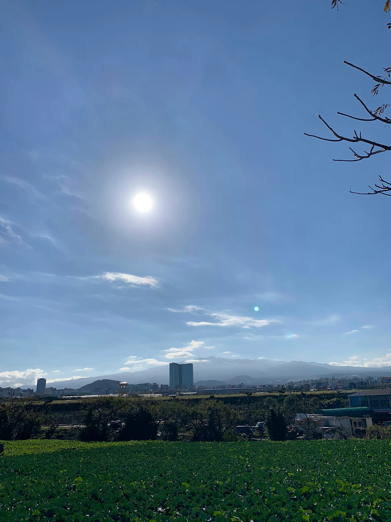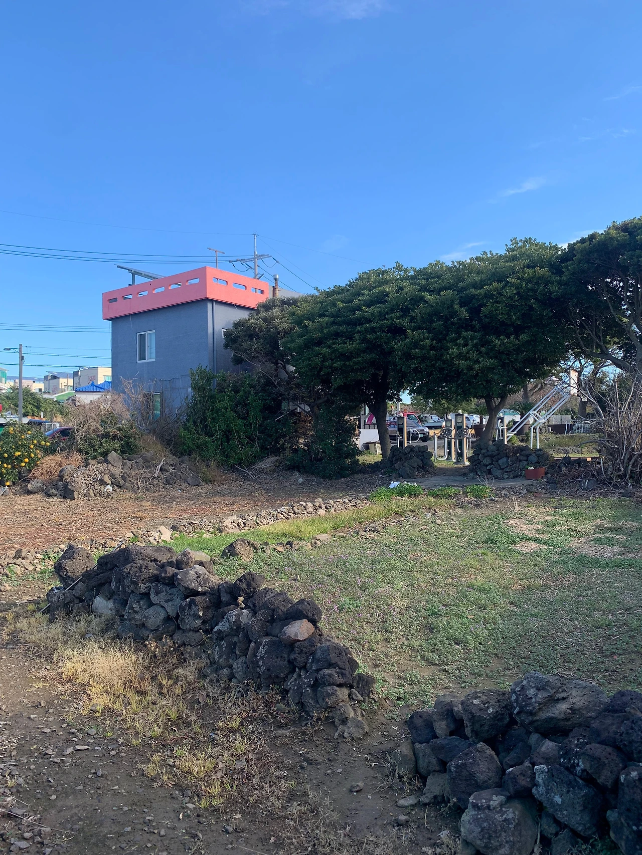 맑은 하늘과 바람이 통과할 수 있는 돌담이 인상적인 풍경들을 지나 저 멀리 한라산이 보였다.