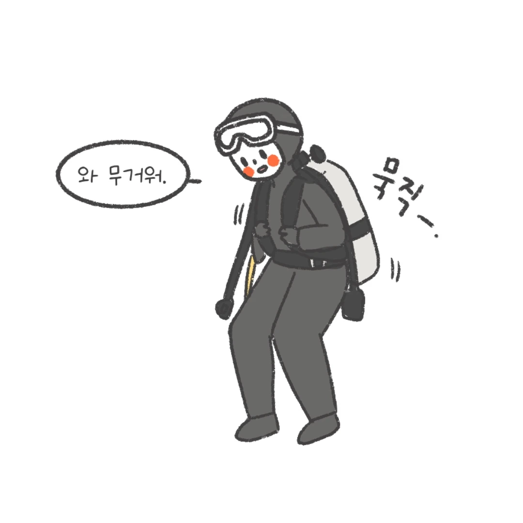 산소통을 등에 매는데 생각보다 더 무거운 산소통의 무게에 놀랐고 허리에 찬 웨이트가 골반을 눌러서 조금 아팠다.